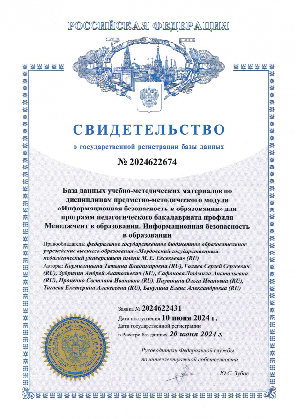 База данных учебно-методических материалов по дисциплинам предметно-методического модуля «Информационная безопасность в образовании» для программ педагогического бакалавриата профиля Менеджмент в образовании. Информационная безопасность в образовании Кормилицына Т.В.