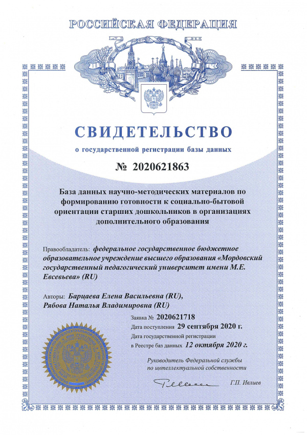База данных научно-методических материалов по формированию готовности к социально-бытовой ориентации старших дошкольников в организациях дополнительного образования Рябова Н.В.