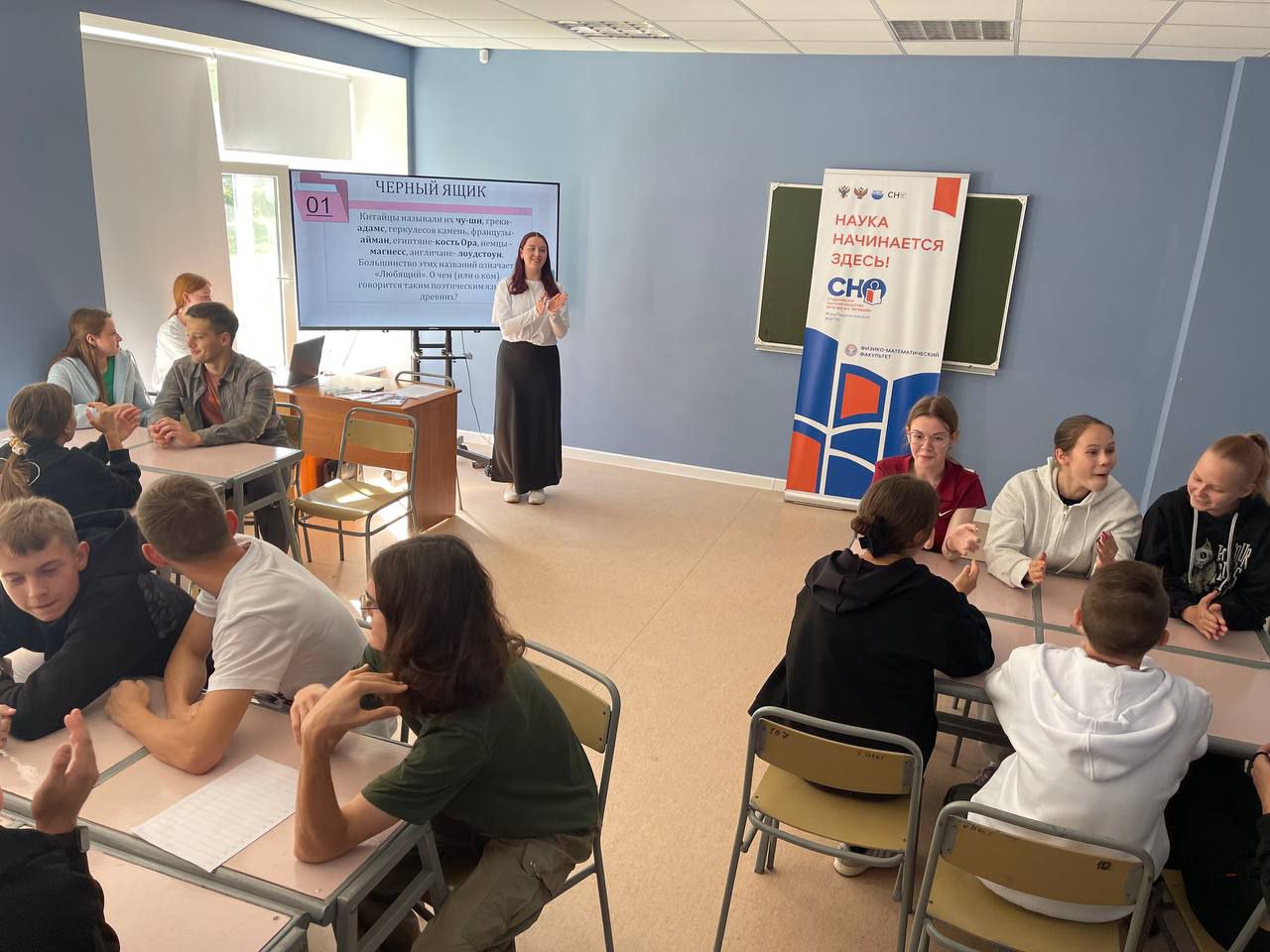Студентов ожидала захватывающая интеллектуальная битва в игре «Что? Где? Когда?» по физике, проверявшая их знания физики, способность быстро мыслить и действовать сообща. Подготовленные вопросы были непростыми, но интересными. Атмосфера игры погрузила всех в атмосферу азарта и соперничества, словно в настоящем научном поединке. Организаторами игры были: Храмова Ольга, Ильина Диана, Лежнева Анастасия, Бибикова Елена, Титкова Юлия, Панина Софья, члены СНО физико-математического факультета.