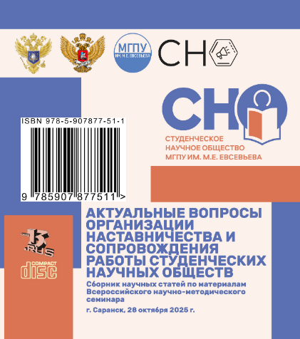 Актуальные вопросы организации наставничества и сопровождения работы студенческих научных обществ: сборник научных статей по материалам всероссийского научно-практического семинара по вопросам организации наставничества и сопровождения работы студенческих научных обществ, г. Саранск, 28 октября 2025 года / редкол.: Л. Е. Игнатьева, М. А. Плаксина, Д. А. Паршина, М. В. Юдина, В. А. Зуева; Мордовский государственный педагогический университет. – Саранск, 2025. – 1 электрон. опт. диск. – ISBN 987-5-907877-51-1.