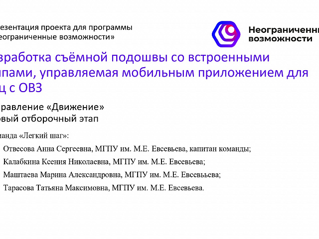 МГПУ им. М. Е. Евсевьева с проектом «Разработка съемной подошвы со встроенными шипами, управляемой мобильным приложением для лиц с ОВЗ» представляли студенты группы МДЭ-121 Отвесова Анна Сергеевна, Калабкина Ксения Николаевна, Маштаева Марина Александровна, Тарасова Татьяна Максимовна.