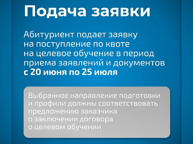 Поступление на места в пределах целевой квоты – это особый формат приема в вуз, который позволяет поступить на обучение по отдельному конкурсу. Гражданин должен изучить полный перечень предложений, которые будут опубликованы заказчиками в сети Интернет на Единой цифровой платформе в сфере занятости и трудовых отношений «Работа в России», выбрать предложение, которое наиболее соответствует его пожеланиям, и подать заявку на заключение договора о целевом обучении в соответствии с этим предложением.