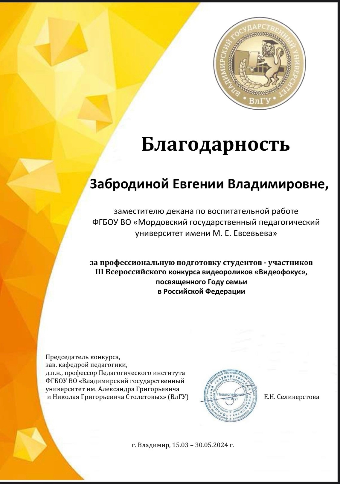 Подведены итоги III Всероссийского конкурса видеороликов, посвященном Году семьи в Российской Федерации «Видеофокус» проведенного на базе Педагогического института Владимирского государственного университета имени Александра Григорьевича и Николая Григорьевича Столетовых».