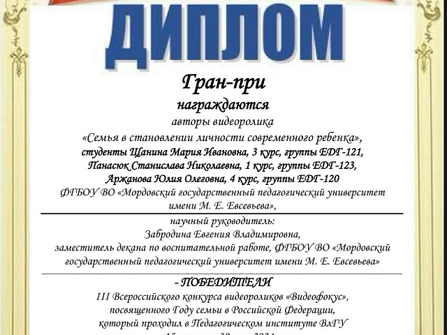Студенты медиа сектора естественно-технологического факультета получили Гран-при и стали победителями в направлении «Семья в становлении личности современного ребенка» с видеороликом «Все начинается с семьи». В нем искренне и трогательно показано, как семья играет важную роль в развитии и формировании личности каждого из нас. Этот ролик напоминает нам о том, что именно семейные ценности и поддержка близких помогают нам преодолевать трудности и двигаться к своим целям.