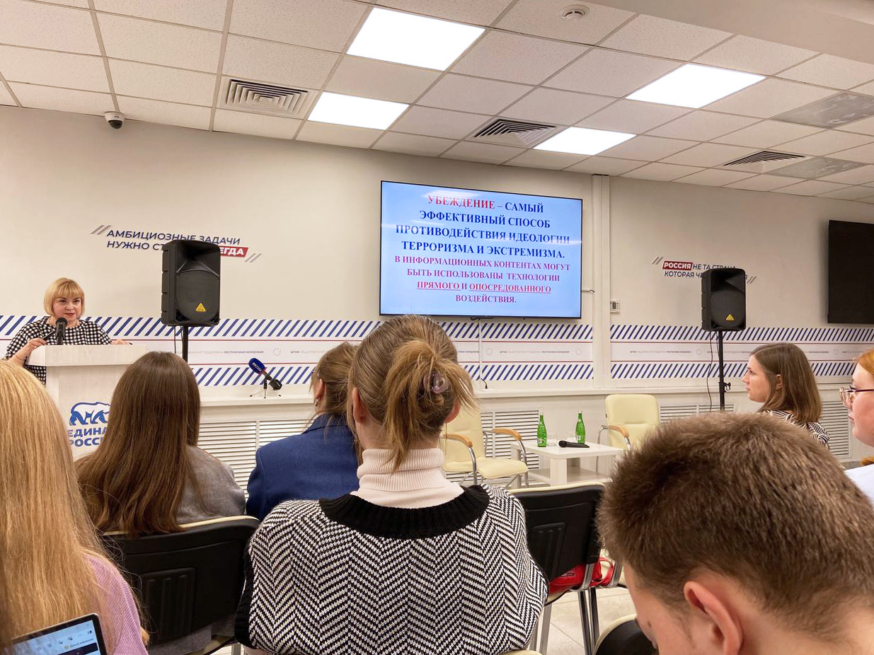 Ключевыми докладчиками семинара стали сотрудники Центра информационной безопасности и психологической помощи Белгородской области. Начальник сводного аналитического отдела Валерия Чуева раскрыла значимость создания и распространения контента, противодействующего идеологии терроризма, а консультант (аналитик) сводного аналитического отдела Анастасия Антонова ознакомила участников с методическими рекомендациями по его подготовке и распространению.