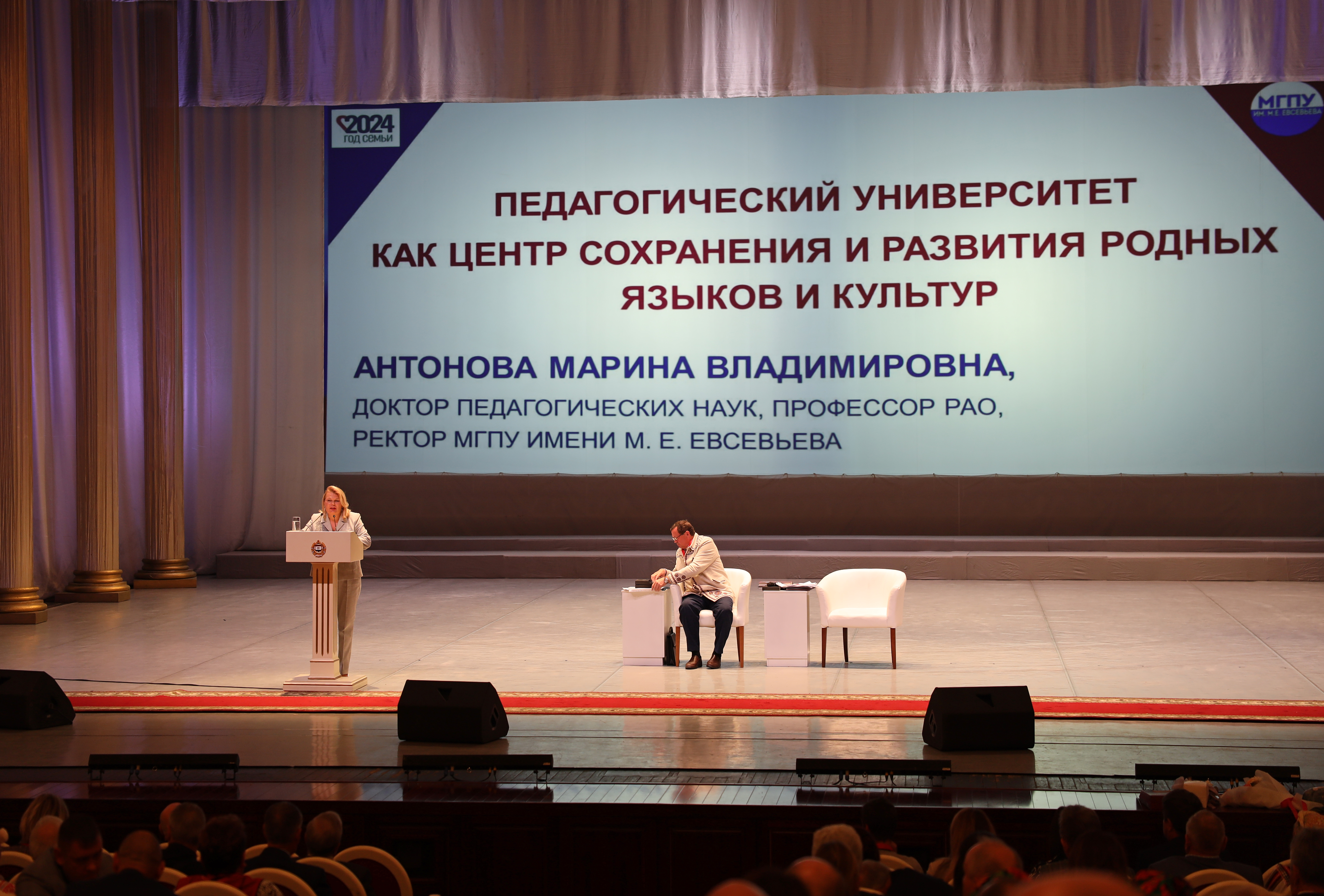 На пленарном заседании выступила ректор МГПУ, доктор педагогических наук, профессор РАО Марина Владимировна Антонова с докладом «Педагогический университет как центр сохранения и развития родных языков и культур».