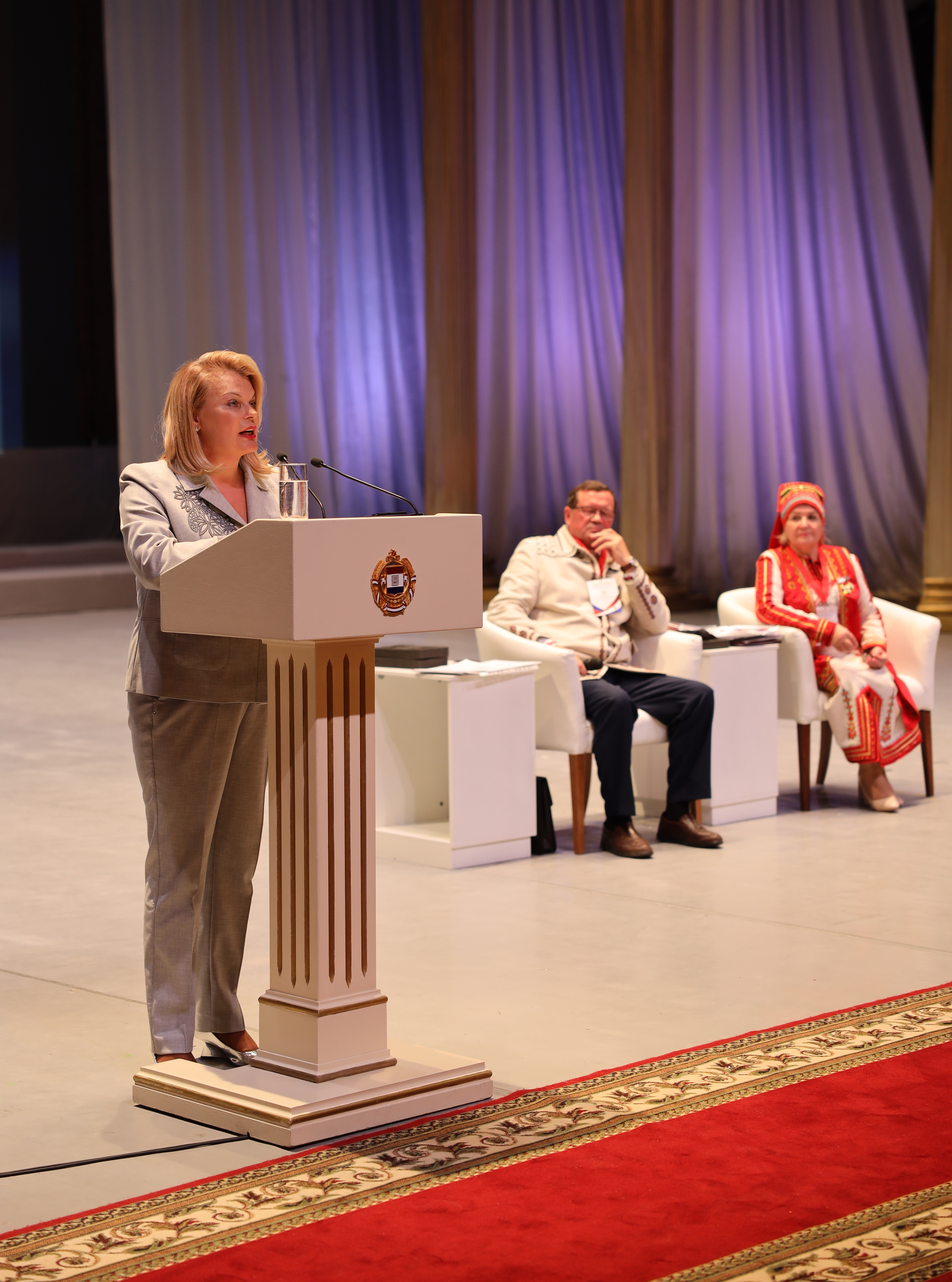 С приветственным словом к гостям и делегатам съезда обратился Глава Республики Мордовия Артем Здунов, который подчеркнул важность сохранения культурного наследия мордовского народа и необходимости его консолидации в условиях современных вызовов: «Для нас важно знать, что есть люди, которые живут далеко от мордовской земли, и, несмотря на это, помнят свои древние корни, сохраняют свой родной язык и свои обычаи, - сказал руководитель республики. - Цель нашего съезда – выработать актуальные решения по сохранению одного из самых больших по численности этносов России, его нематериального этнокультурного наследия».