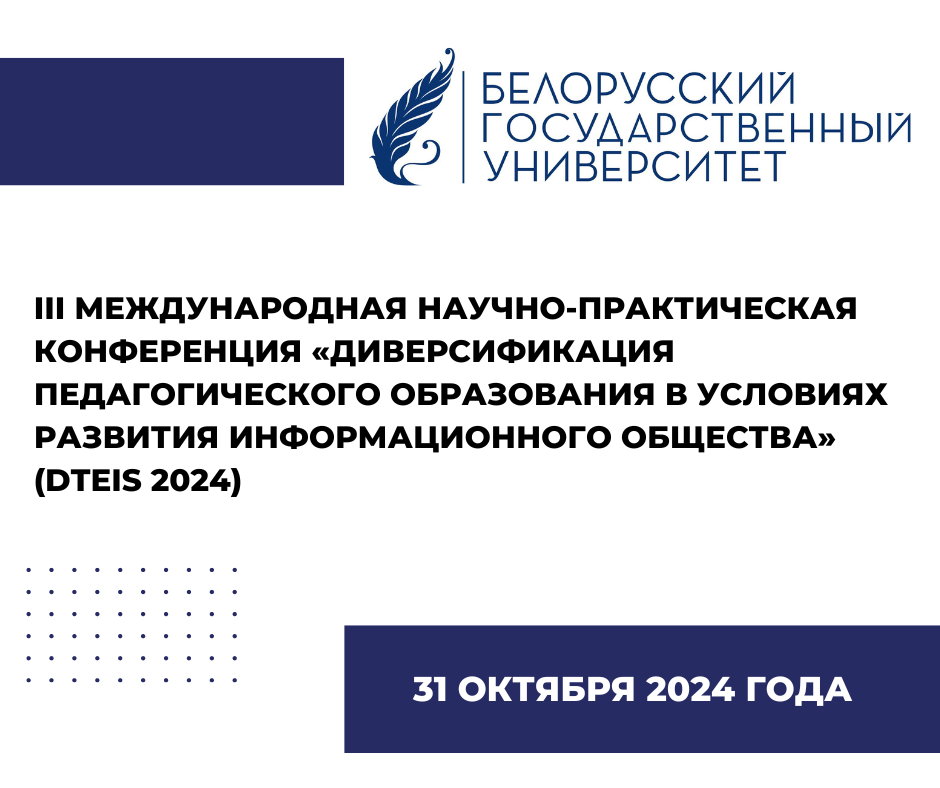Белорусский государственный университет приглашает принять участие в III Международной научно-практической конференции «Диверсификация педагогического образования в условиях развития информационного общества» (DTEIS 2024), которая состоится 31 октября 2024 года в смешанном формате.