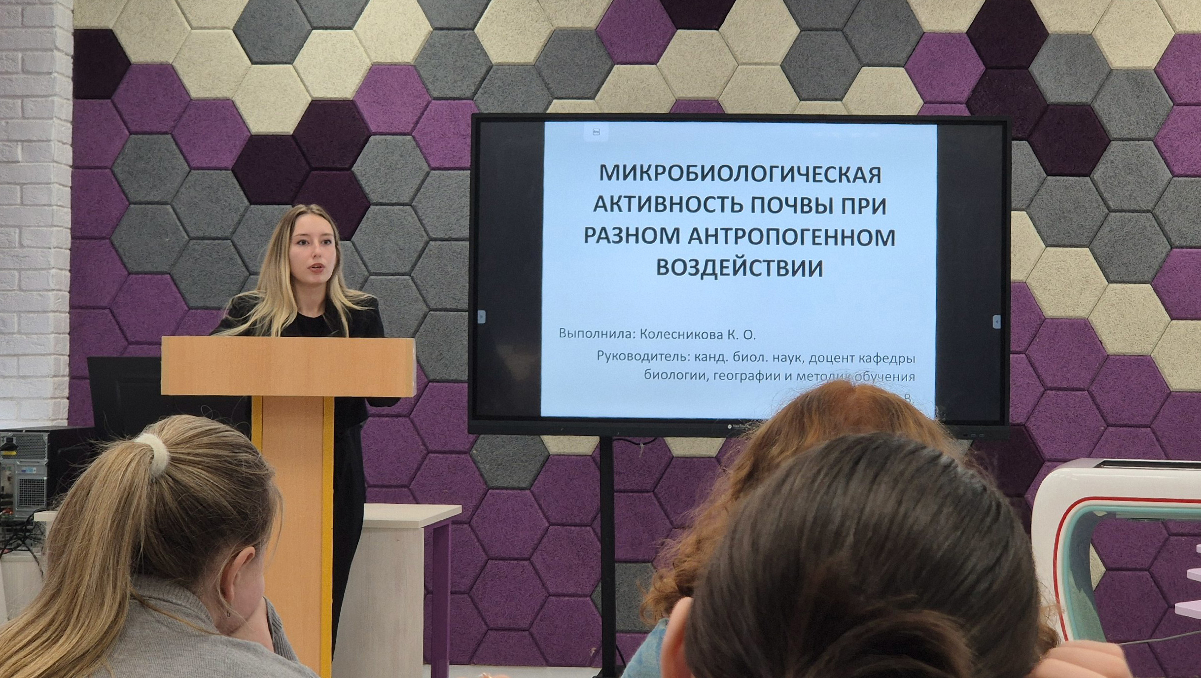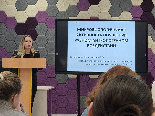 Проблемам экологического мониторинга был посвящен доклад студентки 5 курса профиля «Биология. География» Ларкиной А. Т. с темой «Фитоиндикационные исследования на примере березы бородавчатой».