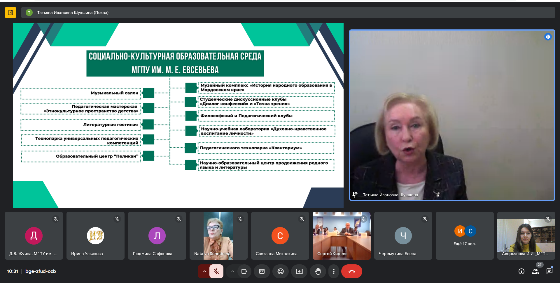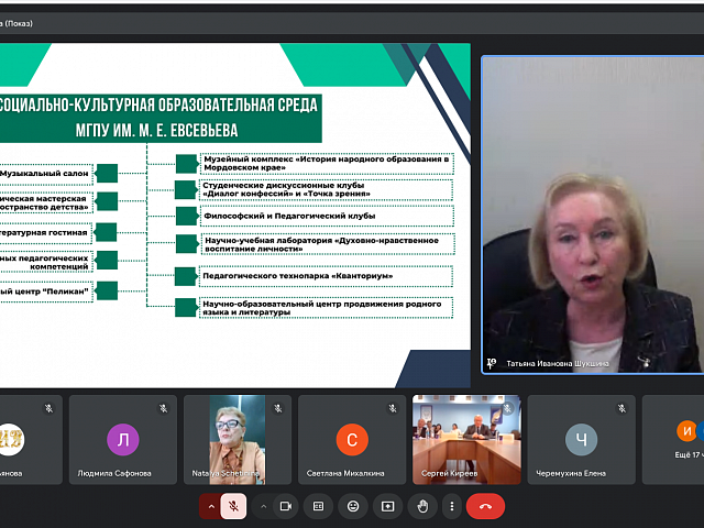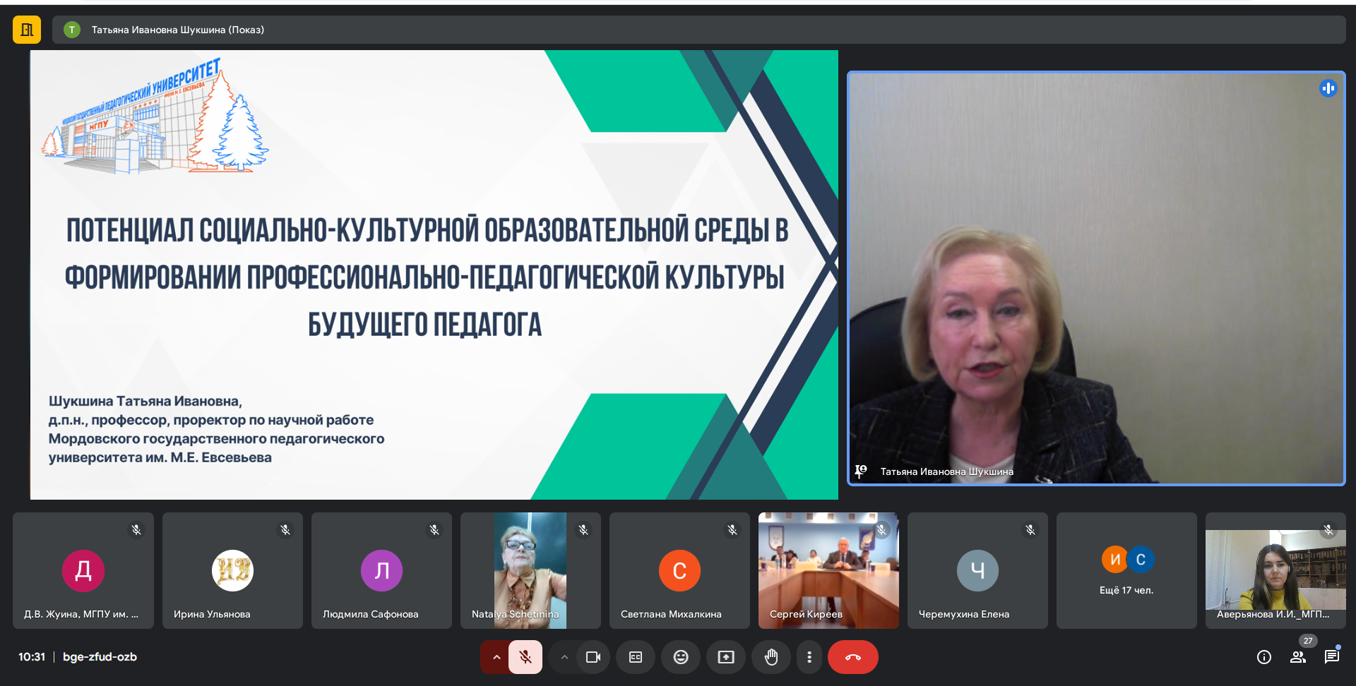 Проректор по научной работе, доктор педагогических наук, профессор Татьяна Ивановна Шукшина выступила на пленарном заседании с докладом на тему «Потенциал социально-культурной образовательной среды в формировании профессионально-педагогической культуры будущего педагога», в котором отметила: «Мордовский государственный педагогический университет имени М. Е. Евсевьева сегодня обладает оптимальными ресурсами для эффективного развития профессионально-педагогической культуры будущих педагогов. Имея необходимый кадровый потенциал, позволяющий транслировать знания в области наук об образовании, в сфере психологии, а также с учетом особенностей регионального рынка труда, университет предоставляет участникам социально-культурной образовательной среды вуза возможность эффективного освоения разных профессиональных компетенций».