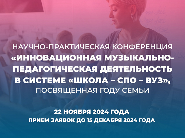 Факультет педагогического и художественного образования и кафедра художественного и музыкального образования приглашают принять участие в работе IX Всероссийской с международным участием научно-практической конференции «Инновационная музыкально-педагогическая деятельность в системе «ШКОЛА – СПО – ВУЗ», посвященной Году семьи, которая состоится 22 ноября 2024 года.