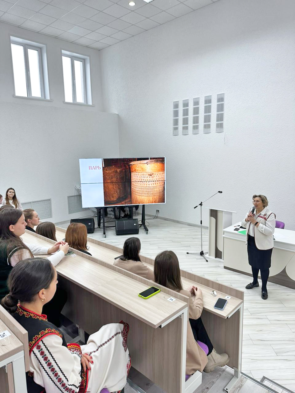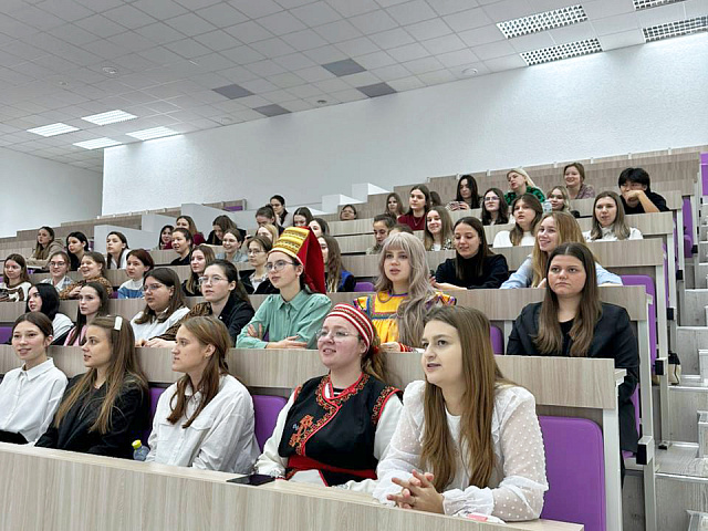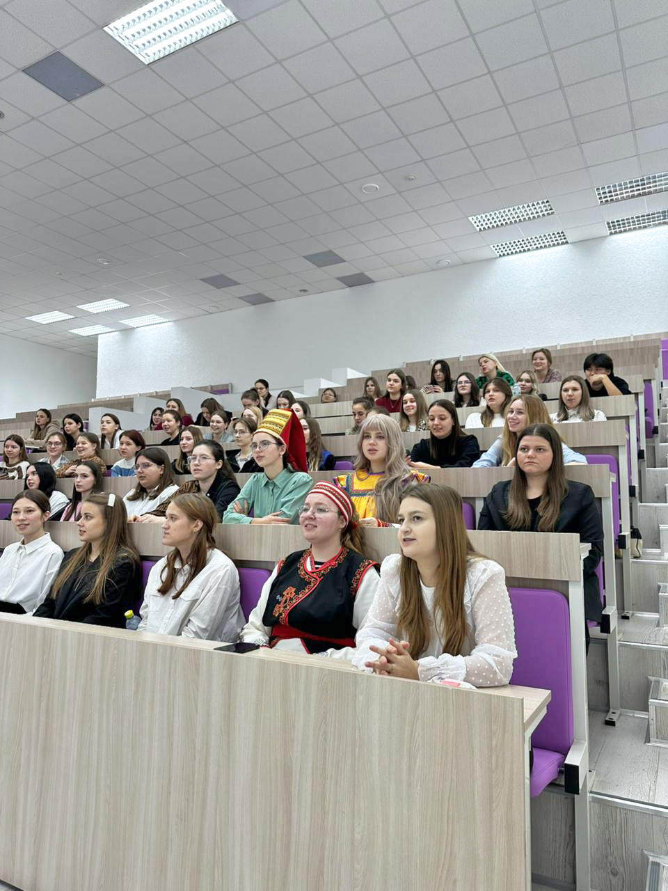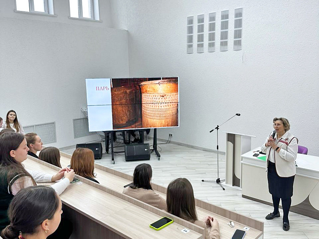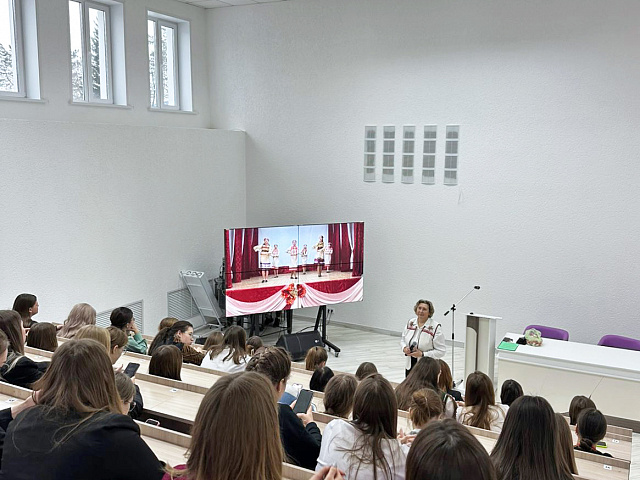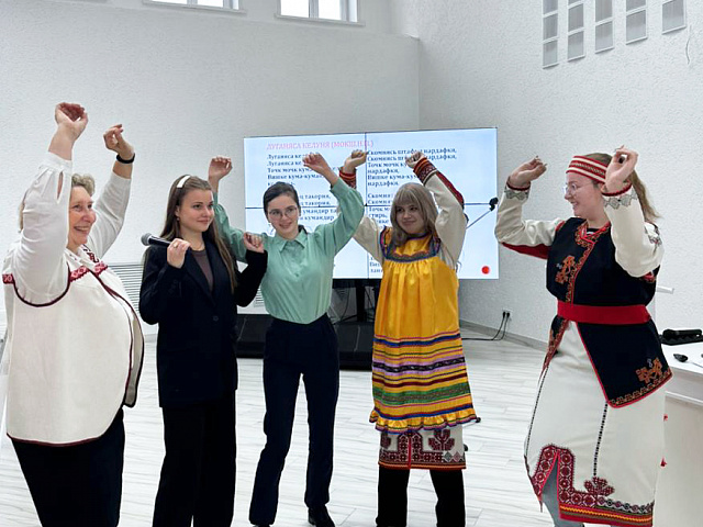 Лектор ознакомила студентов с мордовскими народными песнями как в собственном исполнении, так и в исполнении Екатерины Зиновой, студентки 4 курса профиля Музыка. Дошкольное образование. Евсевьевцев познакомили с выразительными пословицами, загадками и предметами мордовского декоративно-прикладного искусства.