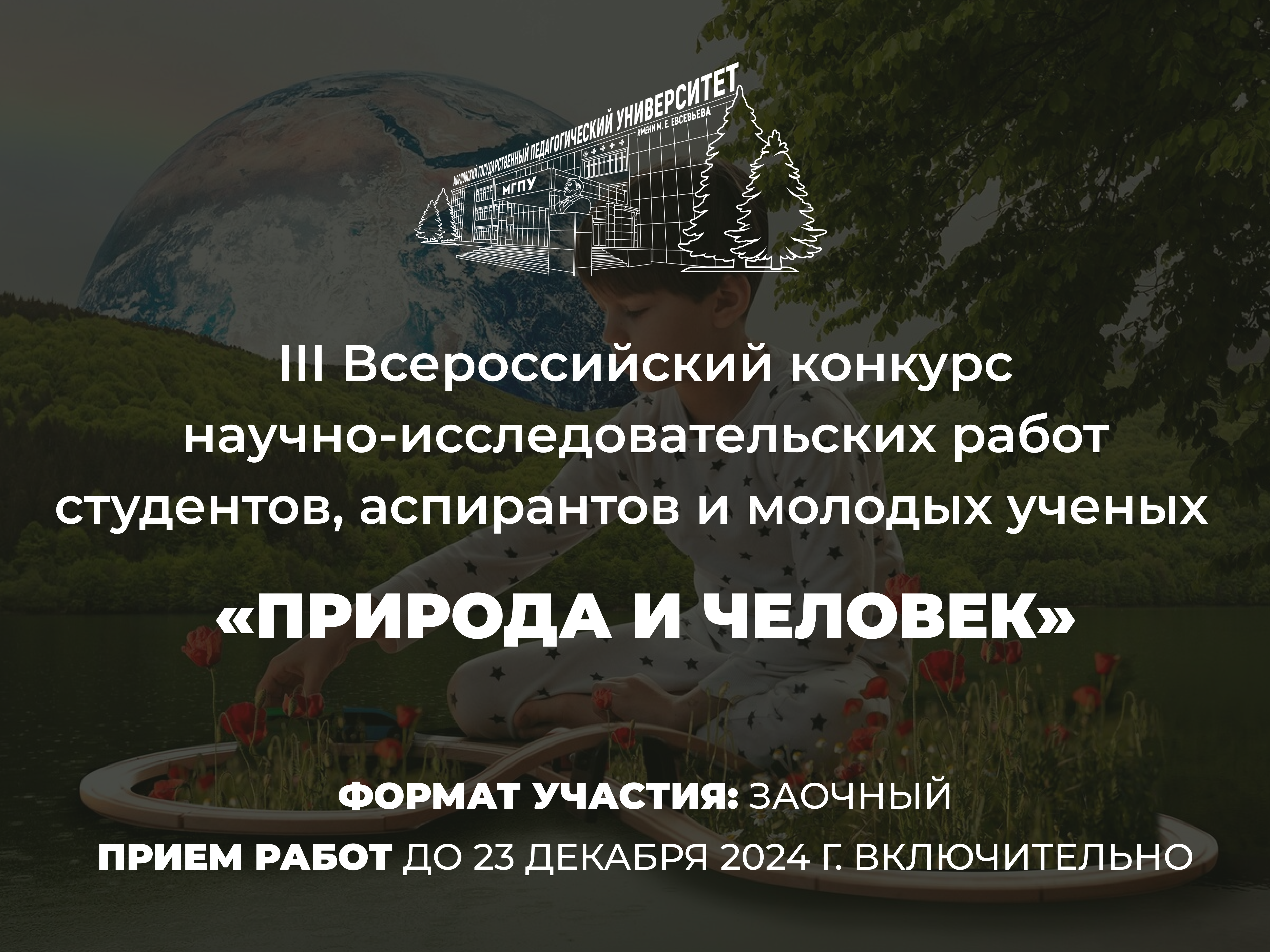 25 декабря 2024 года на базе Межфакультетского технопарка универсальных педагогических компетенций МГПУ имени М. Е. Евсевьева состоится III Всероссийский конкурс научно-исследовательских работ студентов, аспирантов и молодых ученых «Природа и человек».
