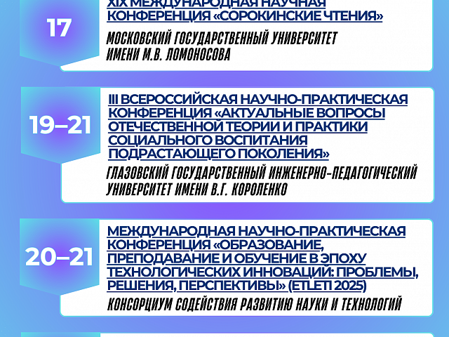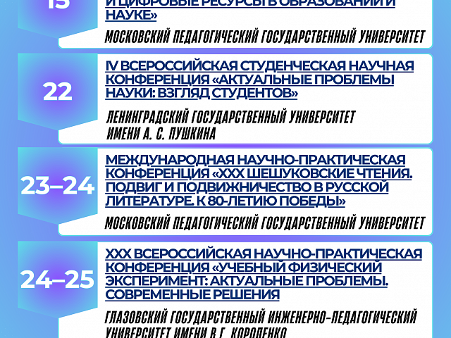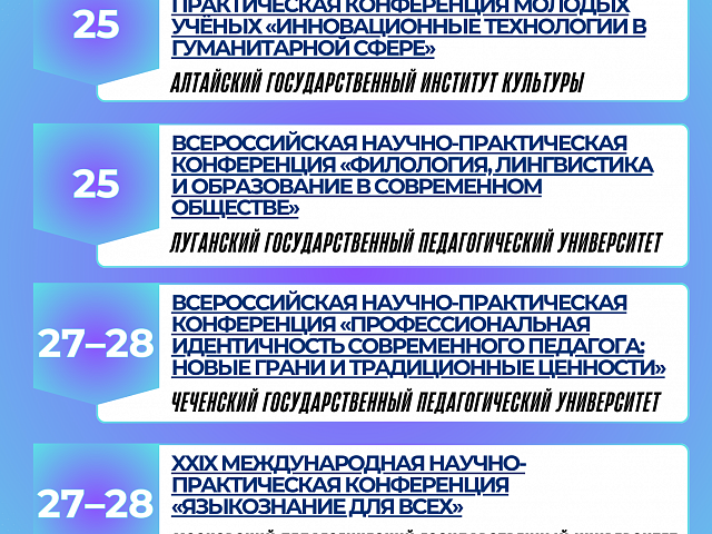 Научные мероприятия – это шанс обменяться опытом, обсудить актуальные проблемы, найти новые идеи и познакомиться с коллегами из разных регионов России и других стран.