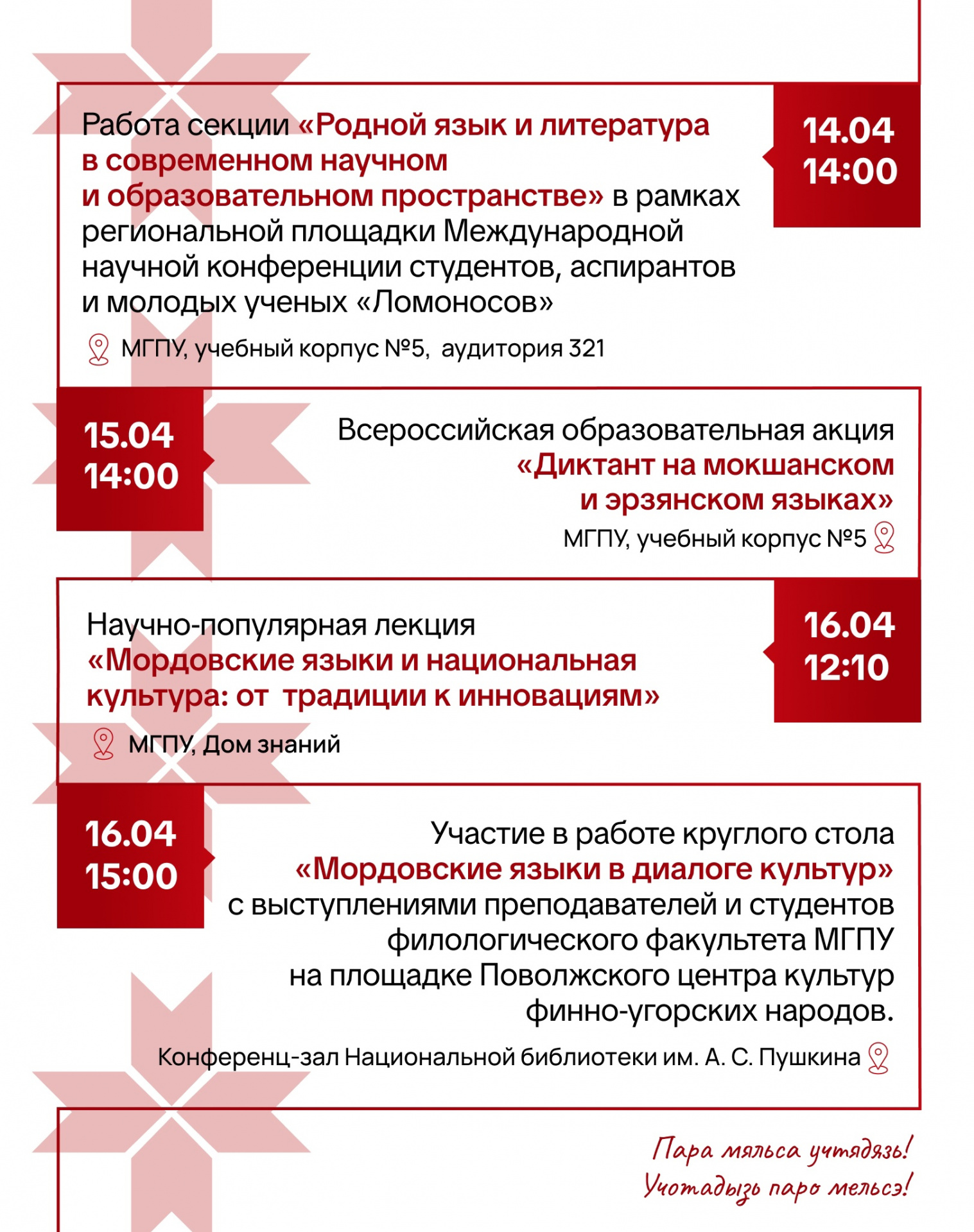 К этому дню на филологическом факультете приурочено проведение Недели мордовских языков. В рамках праздника запланирован целый ряд мероприятий, направленных на популяризацию мордовских (мокшанского, эрзянского) языков среди студентов и учащихся, повышение интереса и мотивации к изучению языков, углублению лингвистической и коммуникативной компетентности обучающихся по мордовским (мокшанскому, эрзянскому) языкам.