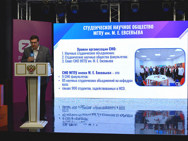 С докладом «Роль студенческого научного общества педагогического университета в становлении педагога-исследователя в регионе» выступил Дмитрий Евгеньевич Биктеев, студент факультета истории права, председатель студенческого научного общества МГПУ им. М. Е. Евсевьева.