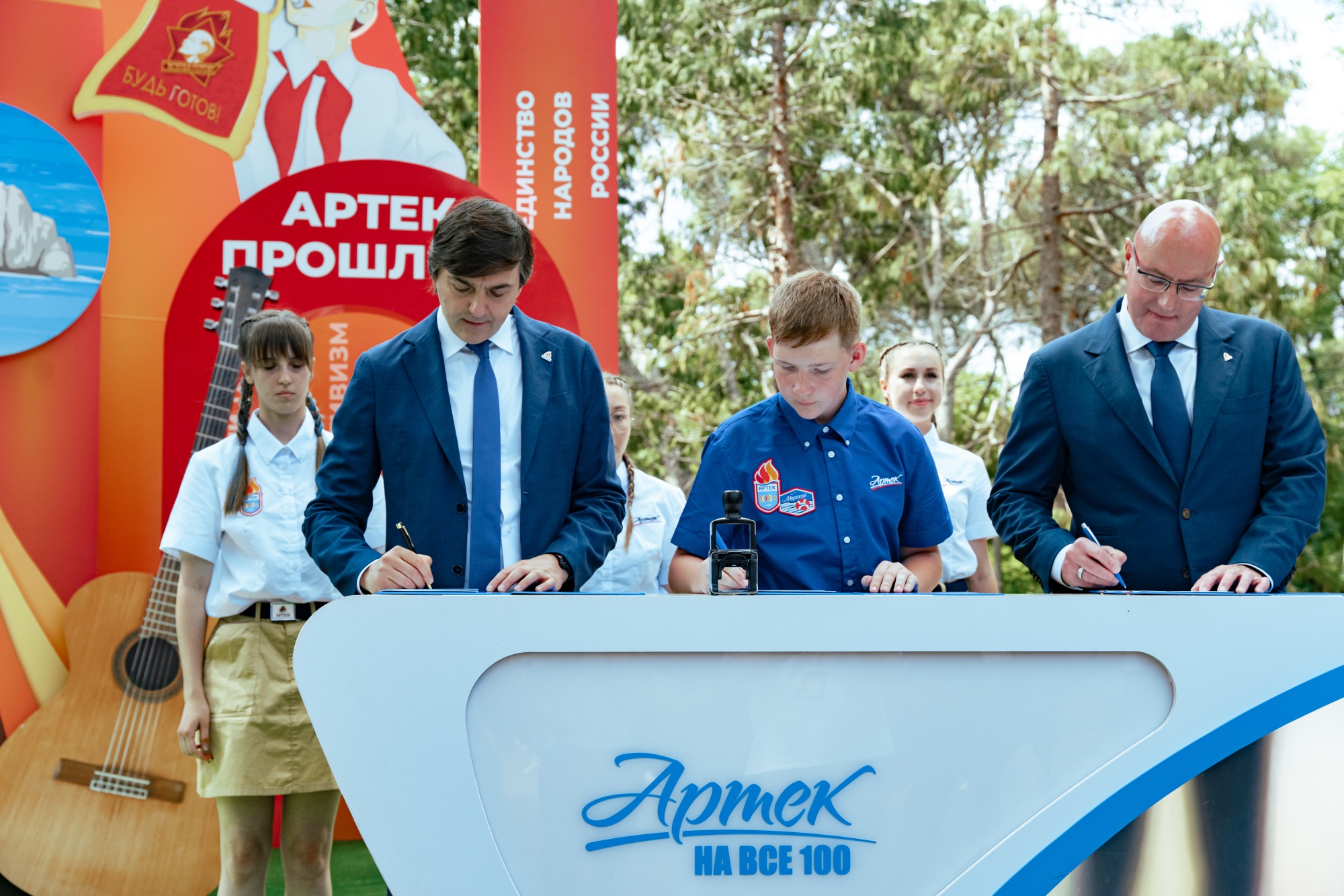 «Быть участниками юбилейной смены – большая честь и привилегия. Вы должны унести в своих сердцах любовь к нашей стране, к «Артеку», познакомиться с ребятами, с которыми вы будете идти по жизни, которые навсегда останутся артековцами и будут с вами. Здесь вы учитесь дружить, работать и приносить пользу нашей стране и своим семьям. Это главное, чему вы должны научиться здесь. «Артек» уже больше 100 лет – теперь можно говорить так – является международным эталоном лучшего детского отдыха. С юбилеем, «Артек»! С праздником, ребята!» – обратился к участникам Дмитрий Чернышенко.