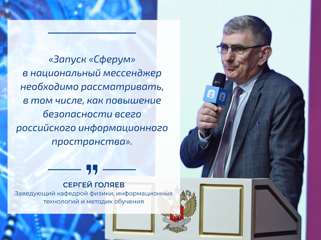 Заведующий кафедрой физики, информационных технологий и методик обучения МГПУ им. М. Е. Евсевьева, Сергей Голяев отмечает: «Запуск «Сферум» в национальный мессенджер необходимо рассматривать, в том числе, как повышение безопасности всего российского информационного пространства».