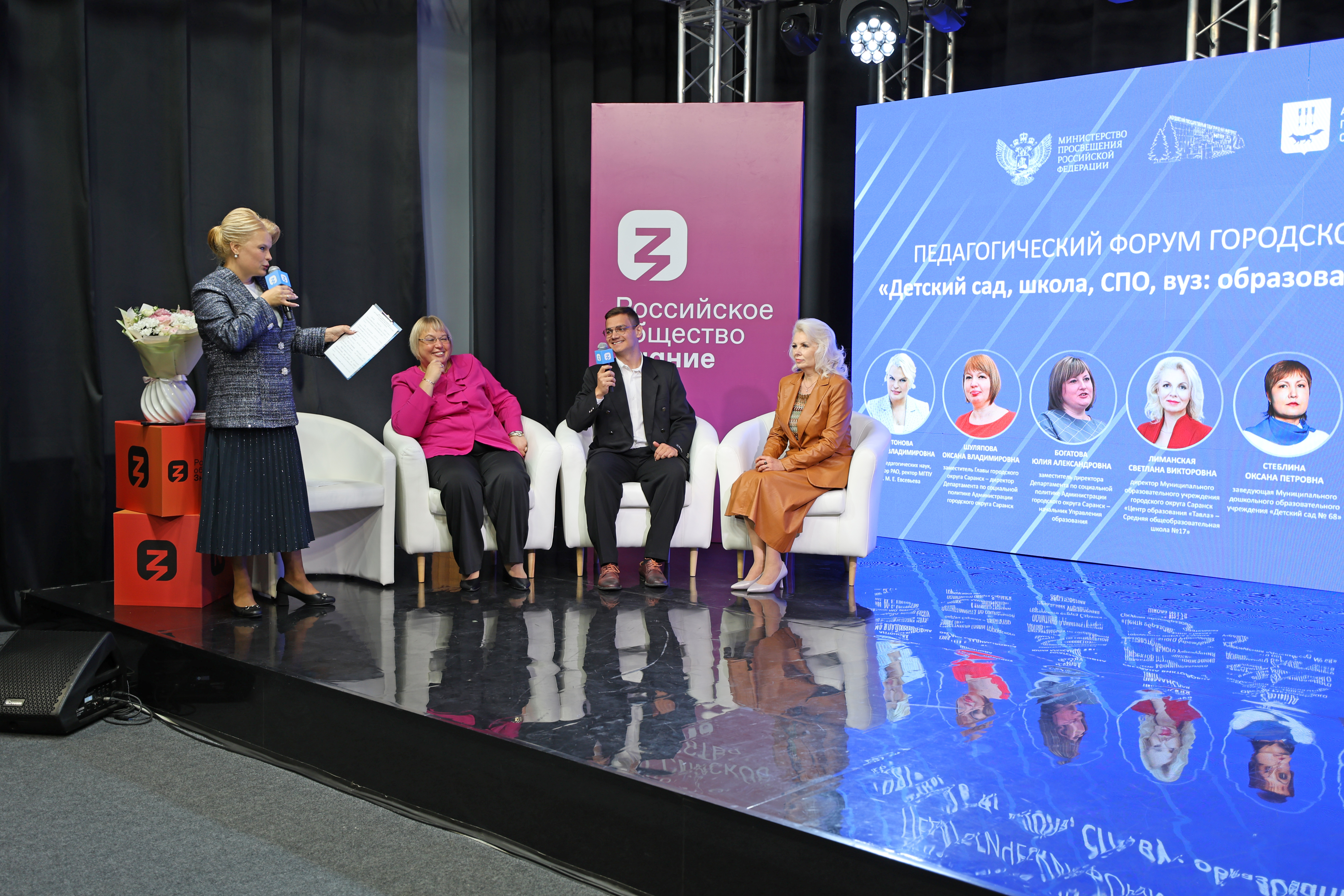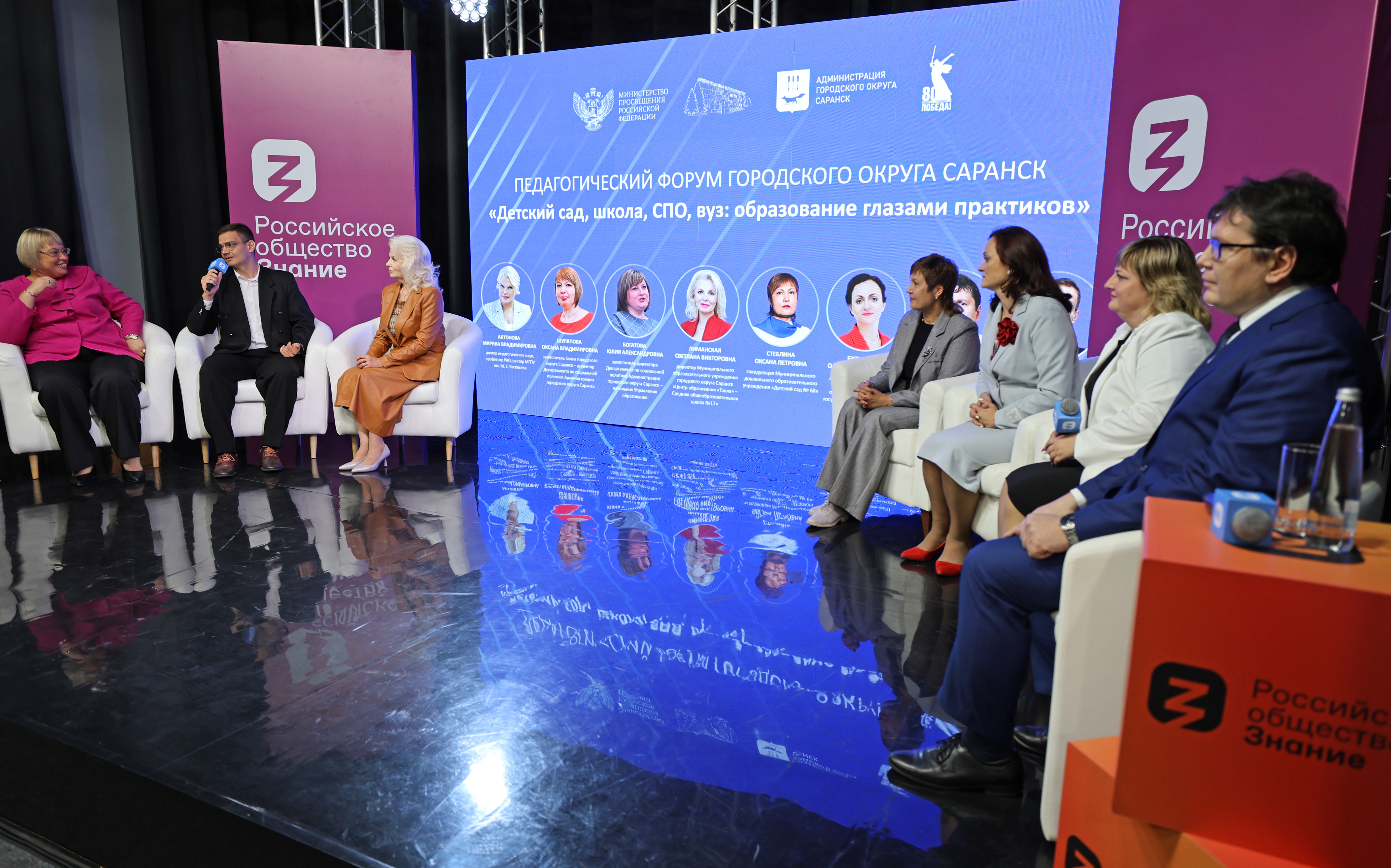 Спикерами полилога с аудиторией стали: ректор Мордовского государственного педагогического университета М. Е. Евсевьева, доктор педагогических наук, профессор РАО Марина Владимировна Антонова, заместитель главы городского округа Саранск – директор Департамента по социальной политике Администрации г.о. Саранск Оксана Владимировна Шуляпова, заместитель директора Департамента по социальной политике Администрации Саранска - начальник управления образования Юлия Александровна Богатова, директор Центра образования «Тавла» - СОШ №17 Светлана Викторовна Лиманская, заведующий детским садом №18 Оксана Петровна Стеблина, декан факультета среднего профессионального образования МГПУ им.М. Е. Евсевьева Олеся Владимировна Бузыкина, декан физико-математического факультета нашего педагогического вуза Михаил Владимирович Ладошкин, учитель информатики СОШ №22 Саранска, магистрант 2 курса направления подготовки «Педагогическое образование» профиля «Педагогика высшей школы» МГПУ им. М. Е. Евсевьева Юрий Алексеевич Балясников.