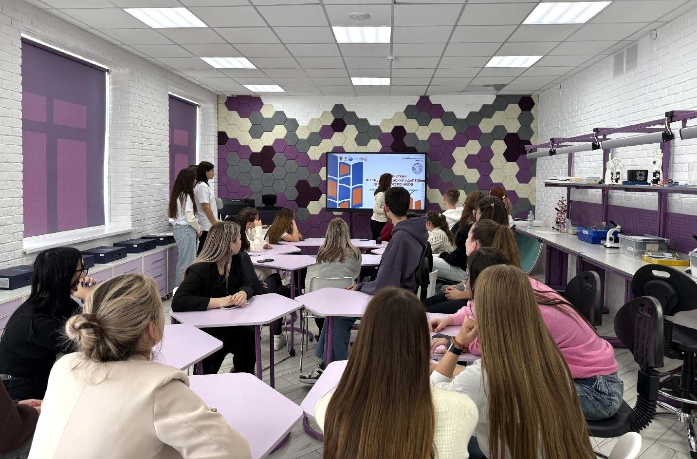 На филологическом факультете реализовывали интерактивный нетворкинг «Познакомимся с наукой!» и ряд мастер-классов. Первокурсники участвовали в брейн-ринге «Филологическое бинго», создавали научные проекты в рамках мастер-класса «Создаем научные проекты», а в театральной лаборатории «Эксперимент с текстом» анализировали современные кейсы – нейросети, феминитивы, заимствования – и представляли свои интерпретации в мини-театрализациях. 62 студента открыли для себя науку как пространство креатива и интерпретации.