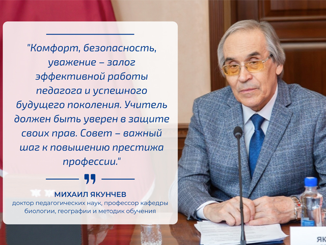 «Сегодня как никогда важно создать условия для комфортной и безопасной работы наших педагогов. Учитель должен быть уверен в том, что его права защищены, а его профессиональная деятельность ценят и уважают. Создание Совета по защите профессиональной чести и достоинства педагогов – это важный шаг в направлении повышения престижа педагогической профессии и укрепления доверия между учителем, учеником и родителями. Именно в атмосфере взаимного уважения и поддержки возможно эффективное обучение и воспитание подрастающего поколения».