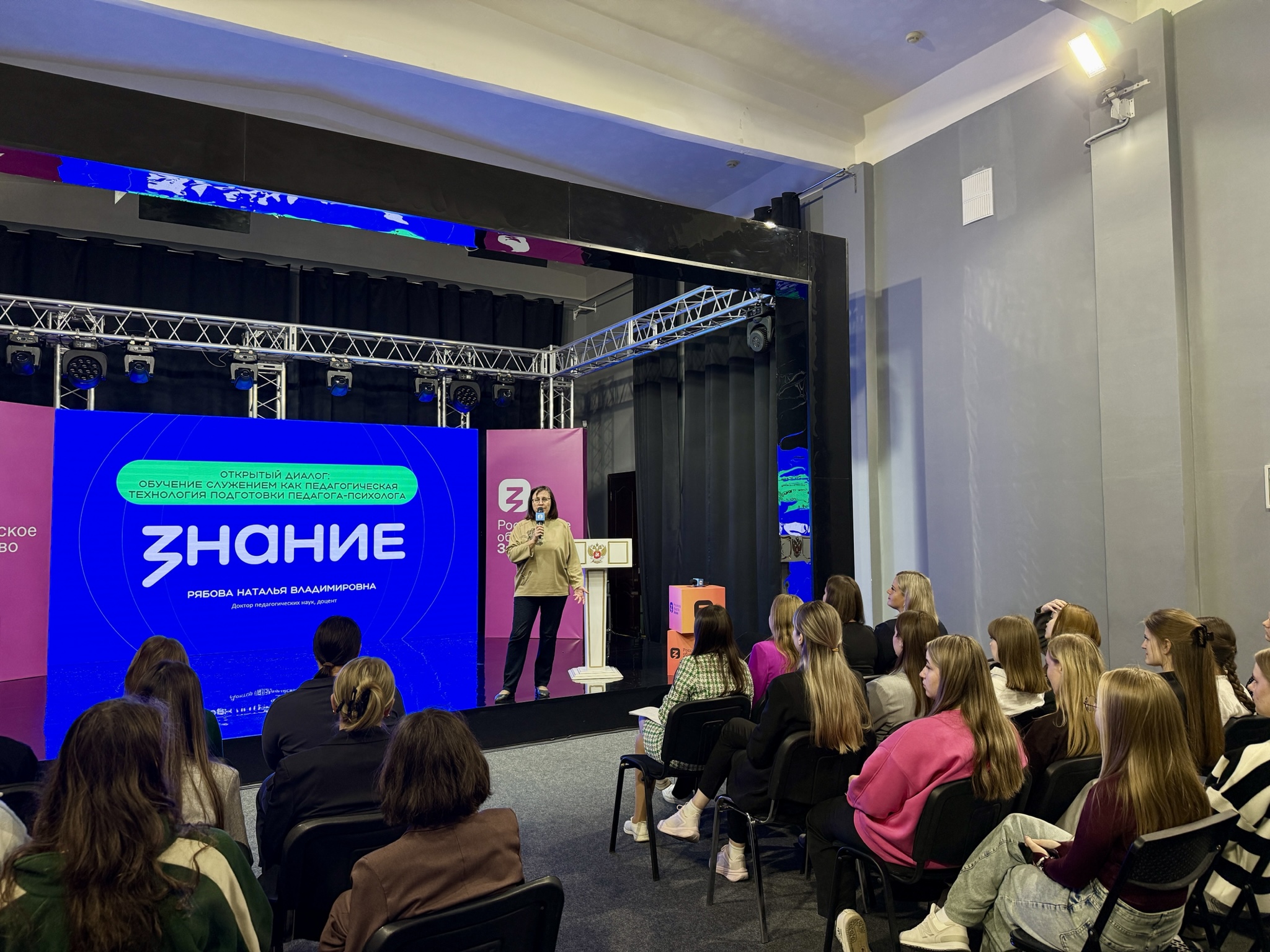 В ходе лекции Рябовой Н. В. была рассмотрена концепция «обучение служением» как методологический подход к подготовке специалистов в области педагогики и психологии. Было раскрыты историческое развитие идеи служения, сущность этого образовательного метода, его основные принципы и методологические основы. Также были освещены вопросы внедрения программы «обучение служением» в образовательный процесс высшего учебного заведения и специфика применения концепции на базе факультета психологии и дефектологии.
