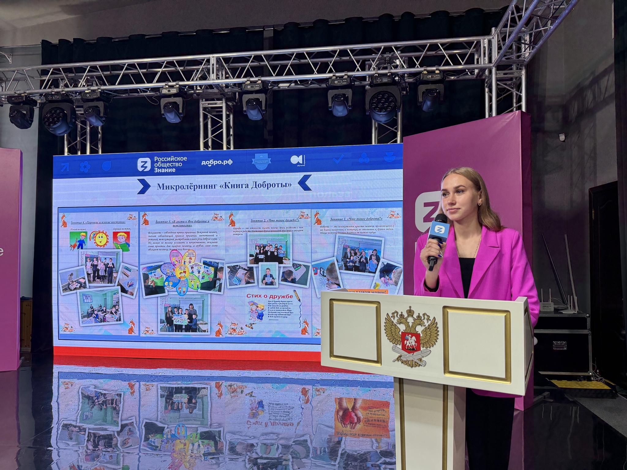 Сафина Залина особое внимание обратила на продукты деятельности детей и студентов, подготовленные в ходе реализации микролёрнинга «Книга доброты». Она рассказала, что итоговым продуктом стала персональная «книга доброты», которую студенты подготовили для каждого ребенка; в книге представлена поучительная сказка про доброго лисёнка со красочными иллюстрациями, а также страничка «хороших поступков» каждого ученика, которая в дальнейшем будет пополняться детьми самостоятельно, что позволит им осознать важность доброты в жизни человека.