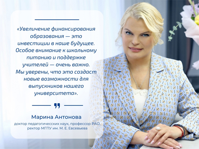 «Значительное увеличение финансирования сферы образования обеспечит динамичное развитие отрасли. Особое внимание хотелось бы обратить на запланированное увеличение финансирования программы бесплатного горячего питания для учащихся начальных классов. Это важная инвестиция в здоровье наших детей, которая, безусловно, положительно скажется на их успеваемости и общем развитии. Наш университет активно участвует в подготовке кадров для системы образования, и я уверена, что увеличение финансирования на популяризацию русского языка, образования и культуры за рубежом откроет новые возможности для наших выпускников. Важно также, что в проекте бюджета предусмотрены меры по поддержке педагогических работников, что, безусловно, будет способствовать повышению престижа профессии учителя и привлечению в систему образования талантливых молодых специалистов».