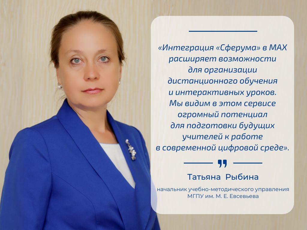 Мнением об интеграции сервиса «Сферум» в мессенджер MAX поделилась Татьяна Михайловна Рыбина, начальник учебно-методического управления МГПУ им. М.Е. Евсевьева: