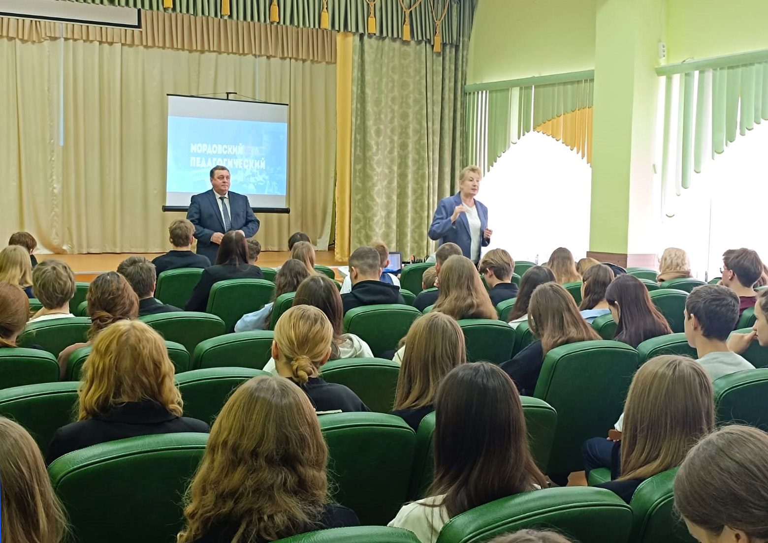 24 октября преподаватели кафедры дошкольного и начального образования, доценты Щемерова Н. Н. и Киркина Е. Н., вместе со студентами университета посетили МАОУ «Козловская средняя школа» и МБОУ «Поселковская средняя школа № 1» имени Героя Советского Союза Зайцева Б. М. в Атяшевском муниципальном районе. В ходе встречи они рассказали одиннадцатиклассникам об особенностях педагогической профессии, богатой истории и структуре университета, а также подробно осветили все тонкости поступления, условия обучения и возможности внеучебной деятельности студентов.