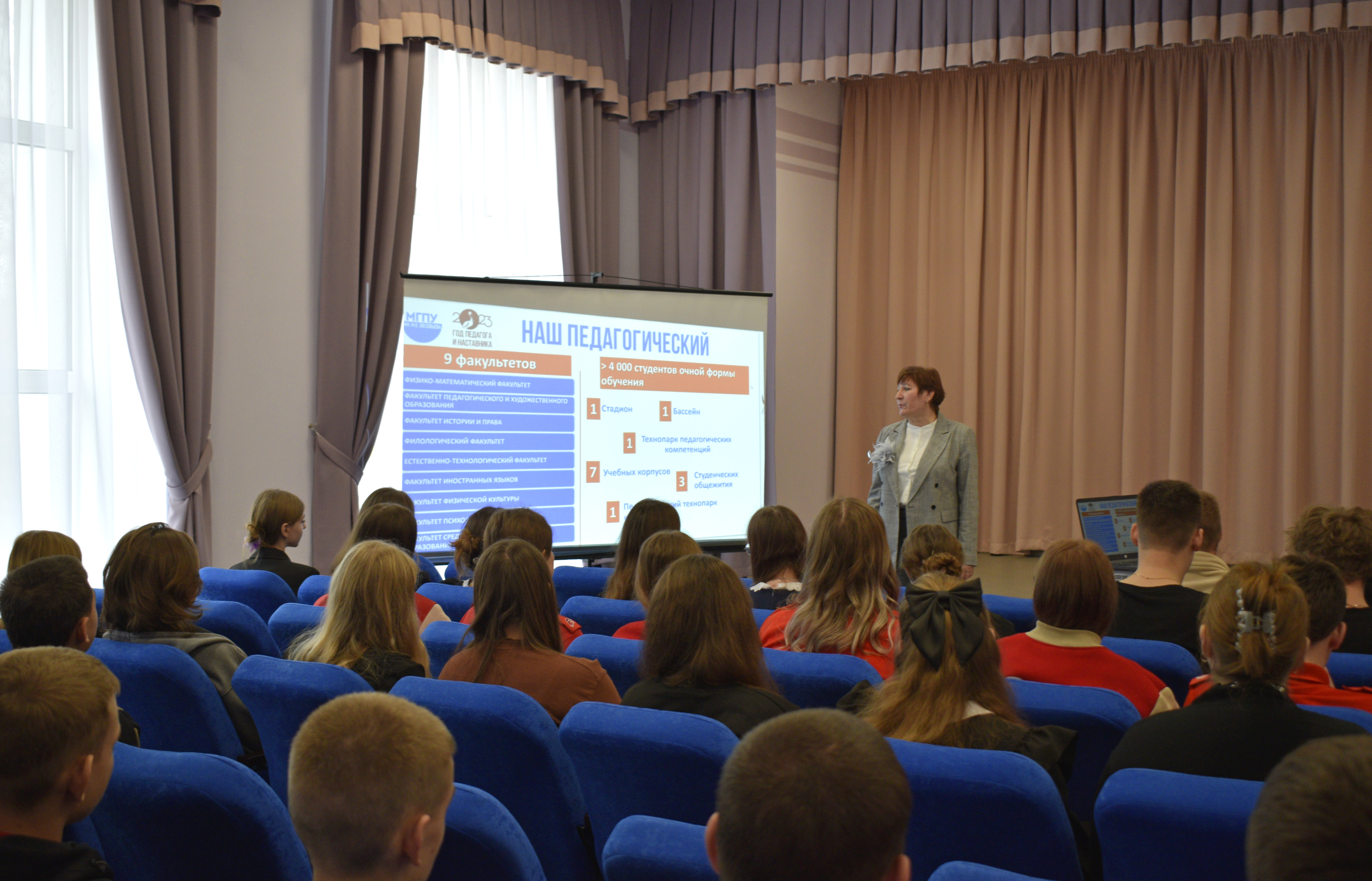 Программа поездки была насыщенной и направлена на знакомство школьников с преимуществами получения высшего педагогического образования в МГПУ им. М. Е. Евсевьева, а также с направлениями и профилями подготовки, реализуемыми в университете. Доценты кафедры отечественной и зарубежной истории и методики обучения Р. Н. Каукина и И. К. Корякова представили потенциальным абитуриентам подробную информацию обо всех возможностях, которые предоставляет МГПУ.