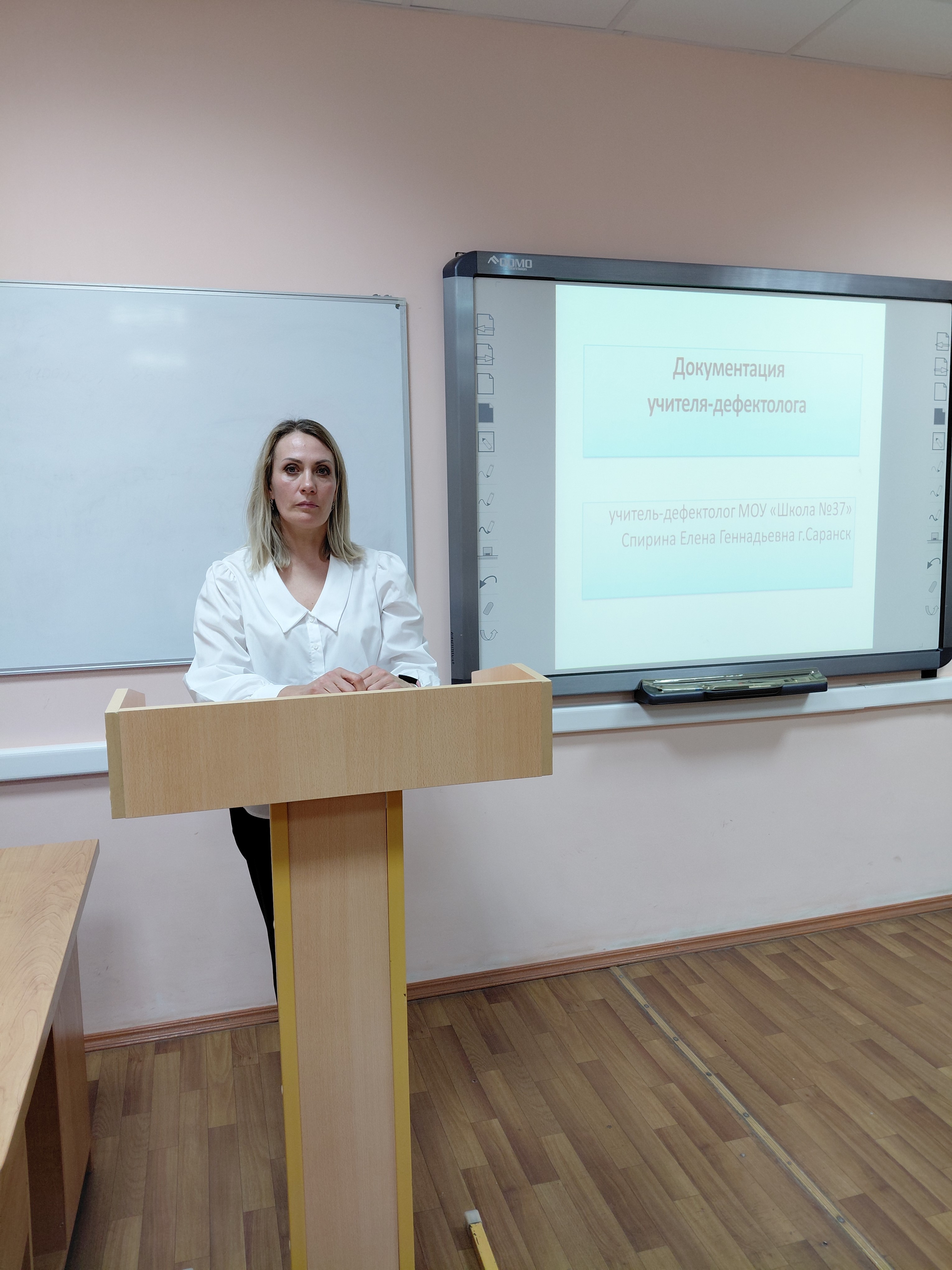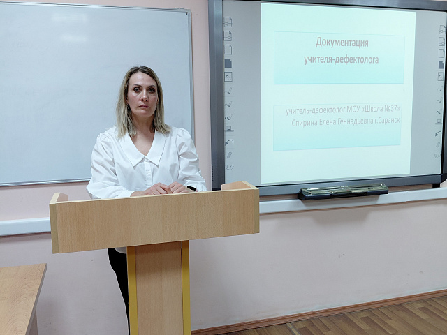 Учитель-дефектолог МОУ «Средняя общеобразовательная школа № 37» г. о. Саранск Е. Г. Спирина презентовала собственный опыт профессиональной деятельности с учетом современных нормативно-правовых документов, регламентирующих деятельность педагога-дефектолога. Познакомила с локальными актами образовательных организаций, регулирующих деятельность учителя-дефектолога, основных видах обязательной документации учителя-дефектолога (рабочей программы, годового плана работы, протоколов дефектологического обследования, расписания коррекционных занятий и др.), формах отчетности перед администрацией образовательной организации.