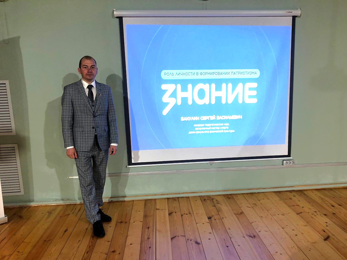 Декан факультета физической культуры Мордовского государственного педагогического университета имени М. Е. Евсевьева, лектор Российского общества «Знание» С. В. Бакулин провел лекцию на тему: «Роль личности в формировании патриотизма» на площадке учебно-практического полигона «Защита Родины».