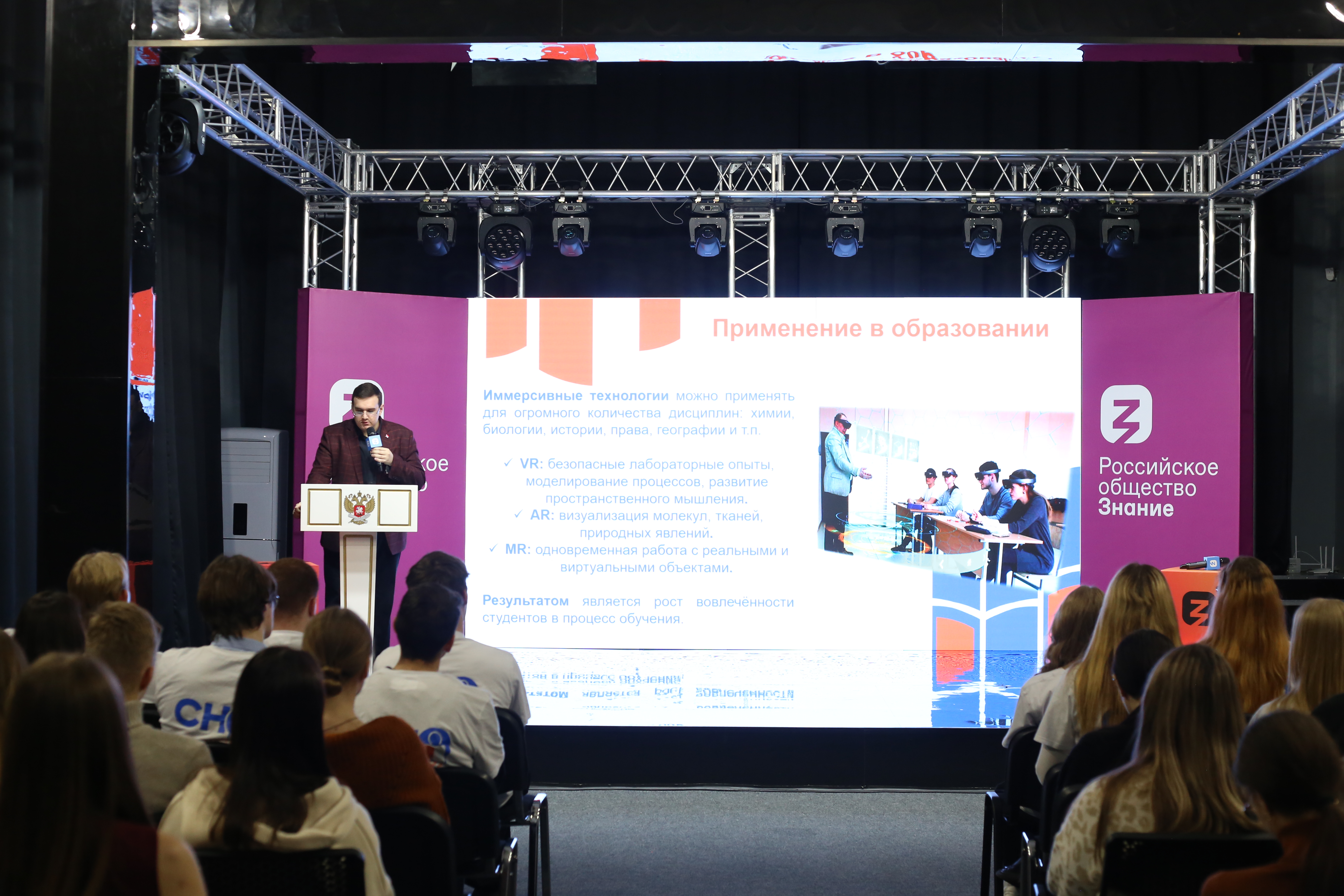 Концептуальная линия сессии была посвящена технологиям, трансформирующим образовательный процесс. ПЛОЩАДКА 1 – Лекция «Иммерсивные технологии в сфере образования и организации студенческой науки» – подробно осветила возможности виртуальной (VR) и дополненной (AR) реальности, а также 3D-моделирования для углубления понимания сложных концепций и повышения мотивации студентов.