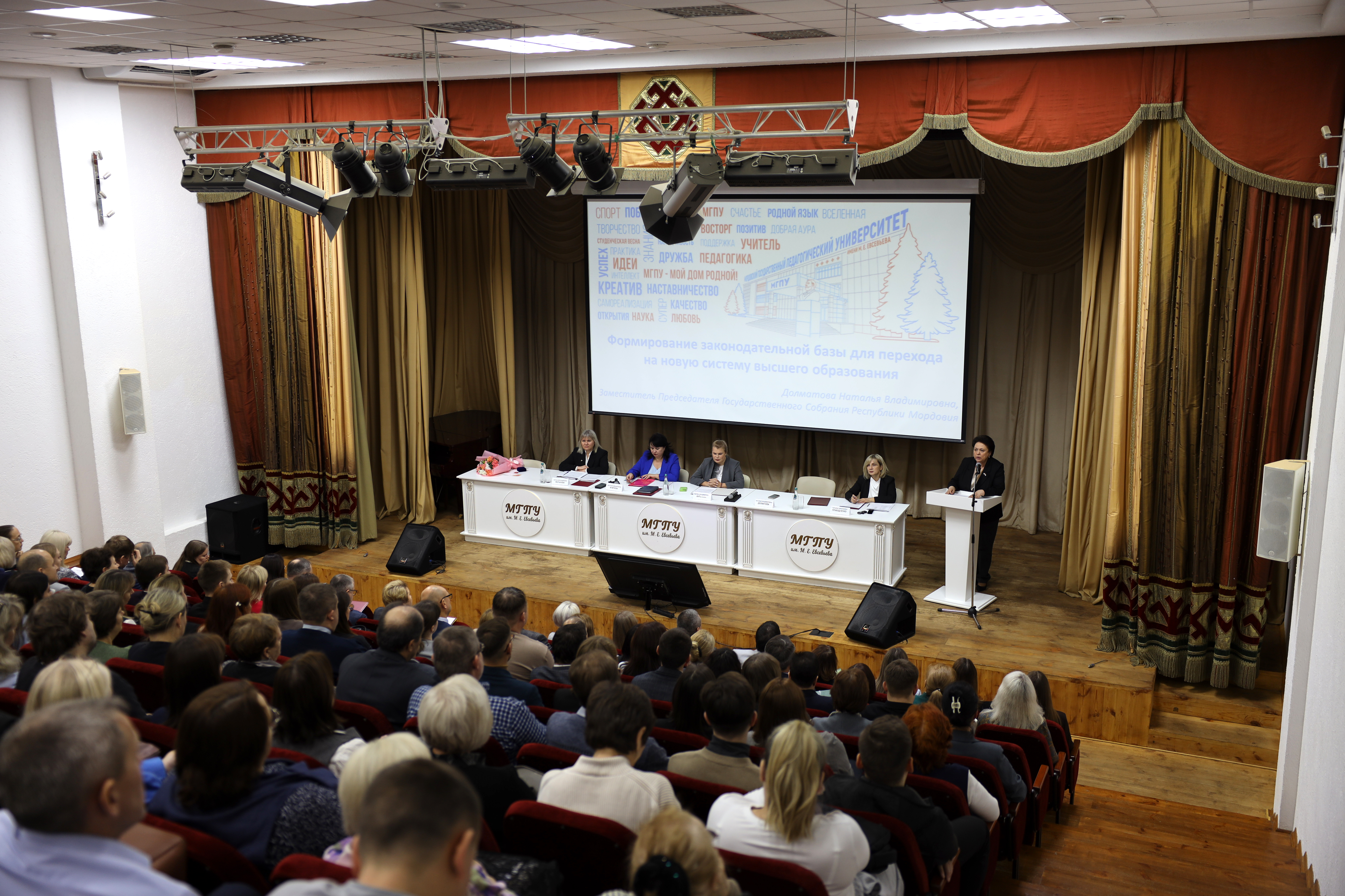 С докладом о формировании законодательной базы для перехода на новую систему высшего образования выступила Заместитель Председателя Государственного Собрания Республики Мордовия Наталья Владимировна Долматова. Обсуждались перспективы и изменения, которые ждут высшее образование в ближайшем будущем.