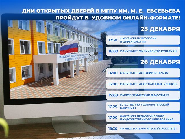 Мордовский государственный педагогический университет имени М. Е. Евсевьева приглашает будущих абитуриентов и их родителей на онлайн-Дни открытых дверей, которые пройдут 25 и 26 декабря 2025 года.