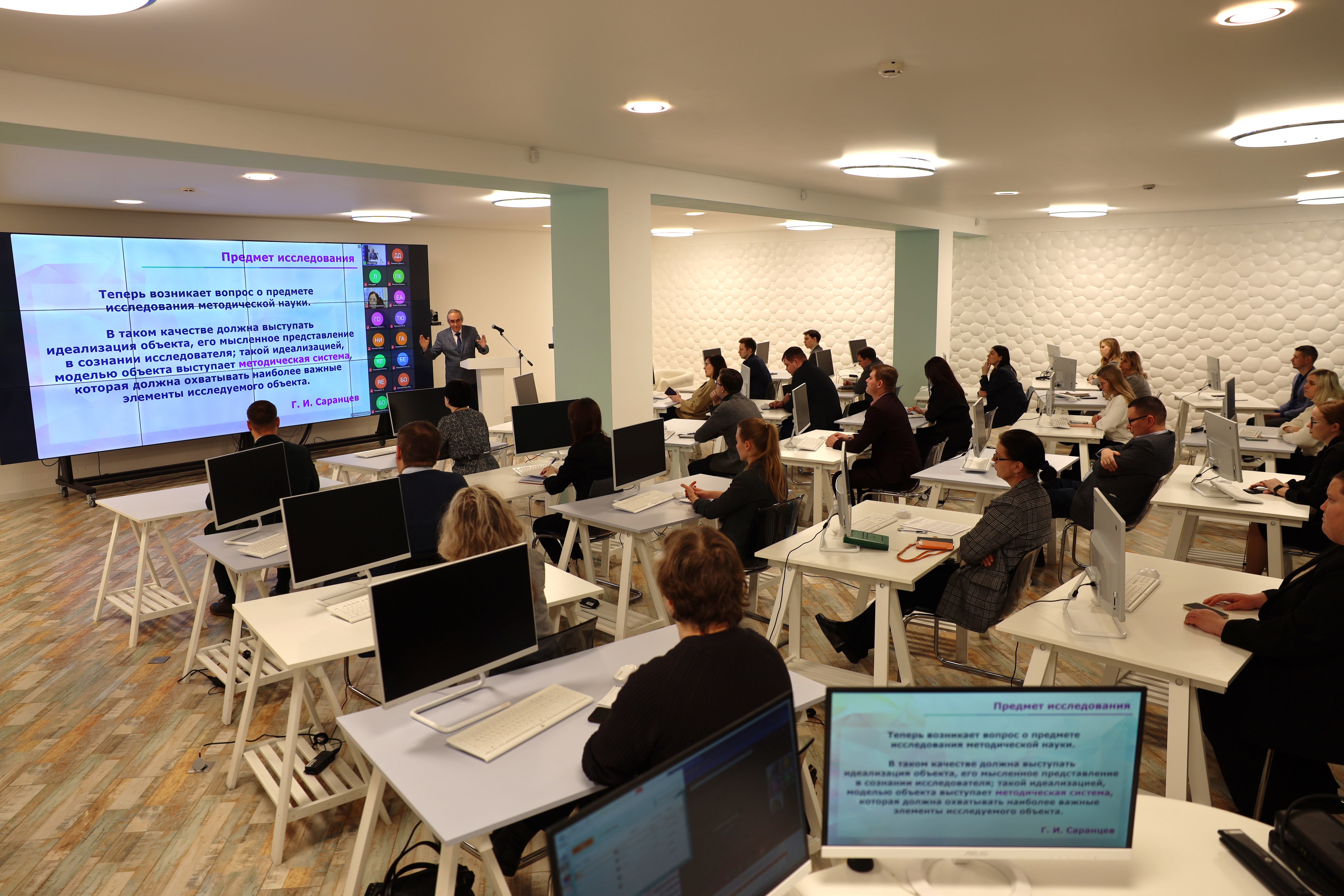 Выступление Михаила Александровича вызвало живой интерес аудитории. Преподаватели активно включились в дискуссию, задавая вопросы, касающиеся различных аспектов методической науки. В частности, были подняты вопросы о соотношении обучения и воспитания в методической науке, о необходимости включения методологического блока в диссертационные исследования, а также о различных концепциях, лежащих в основе содержательного компонента методической модели. На все вопросы были даны исчерпывающие и развернутые ответы.