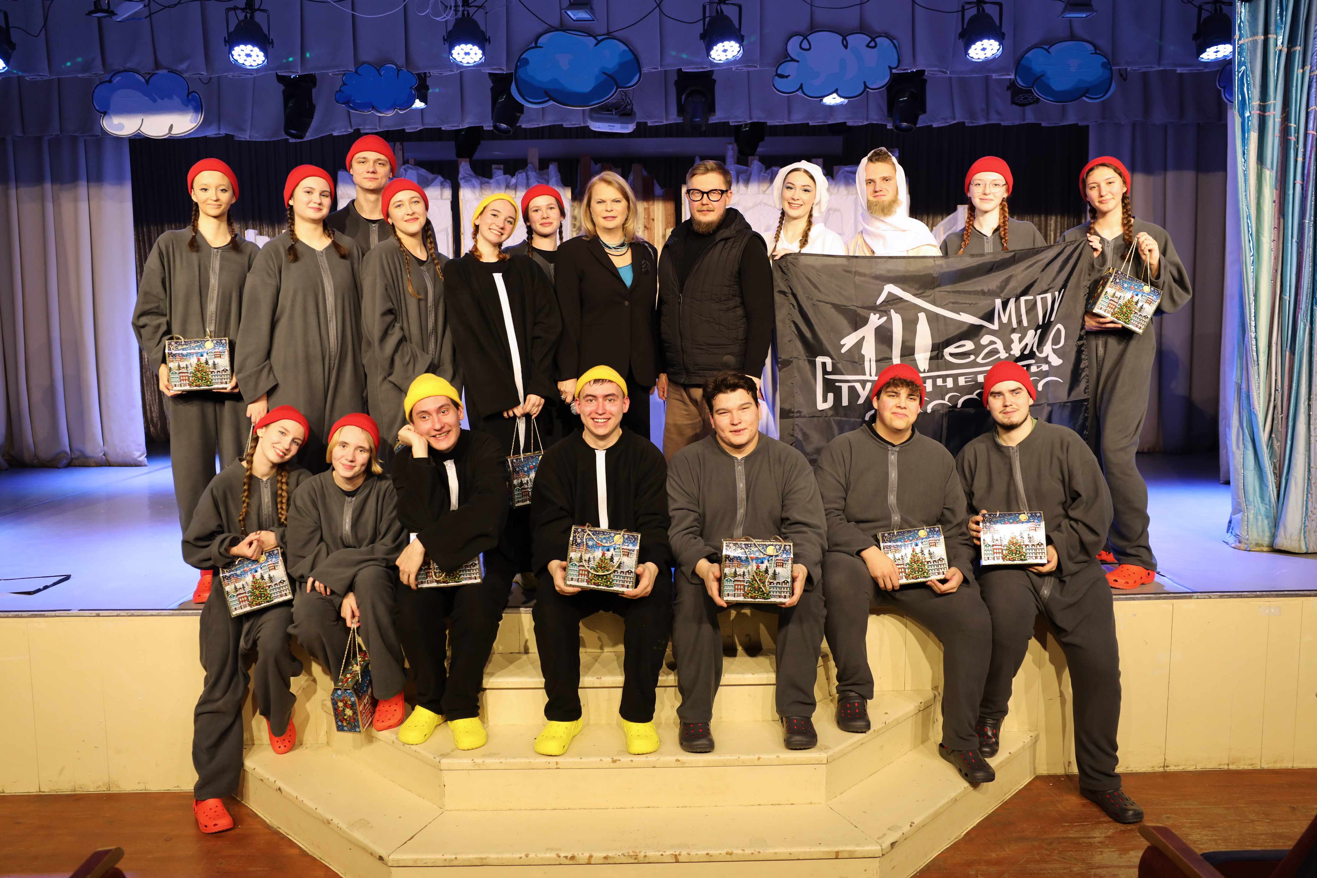 Перед началом спектакля ректор МГПУ им. М. Е. Евсевьева Марина Владимировна Антонова поздравила всех присутствующих с наступающим Новым годом, пожелав здоровья, успехов и вдохновения в новом году.