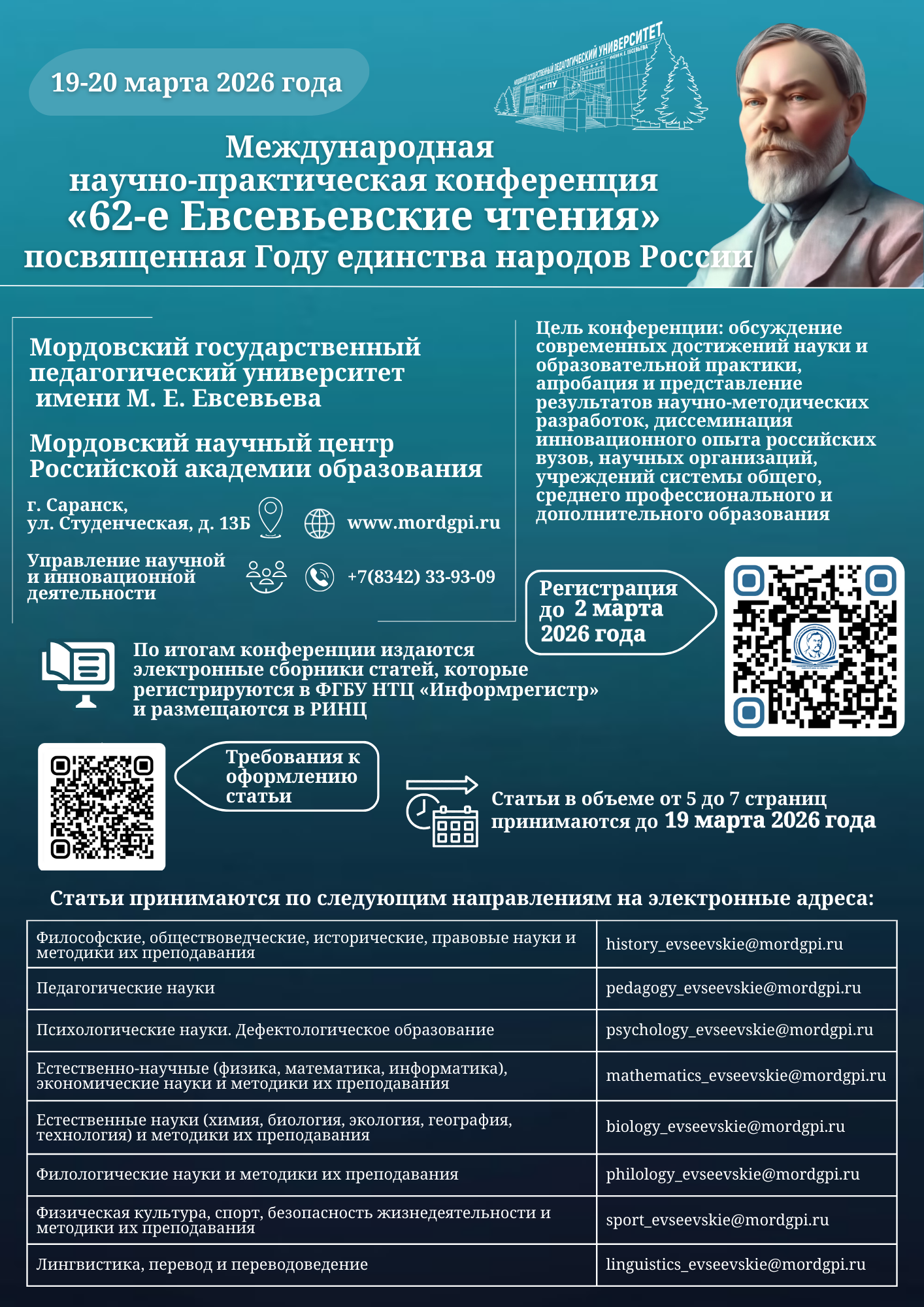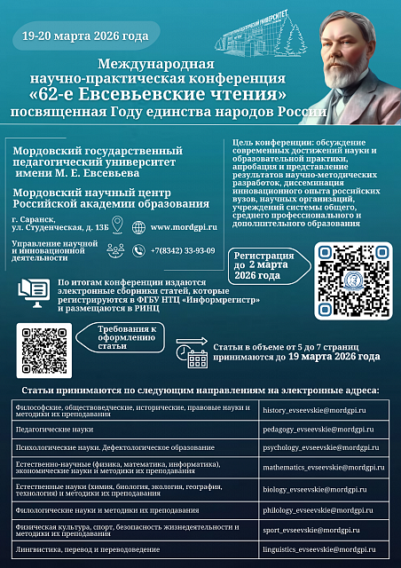Мордовский государственный педагогический университет имени М. Е. Евсевьева приглашает принять участие в работе международной научно-практической конференции «62-е Евсевьевские чтения», посвященной Году единства народов России. Конференция пройдет в смешанном (онлайн и офлайн) формате 19-20 марта 2026 года.