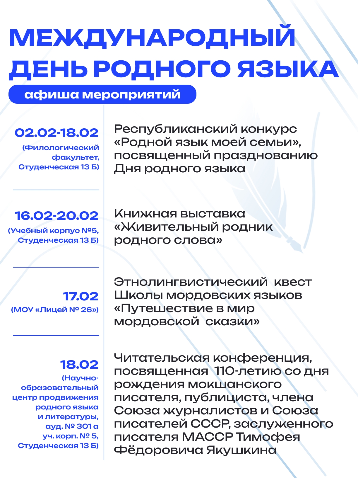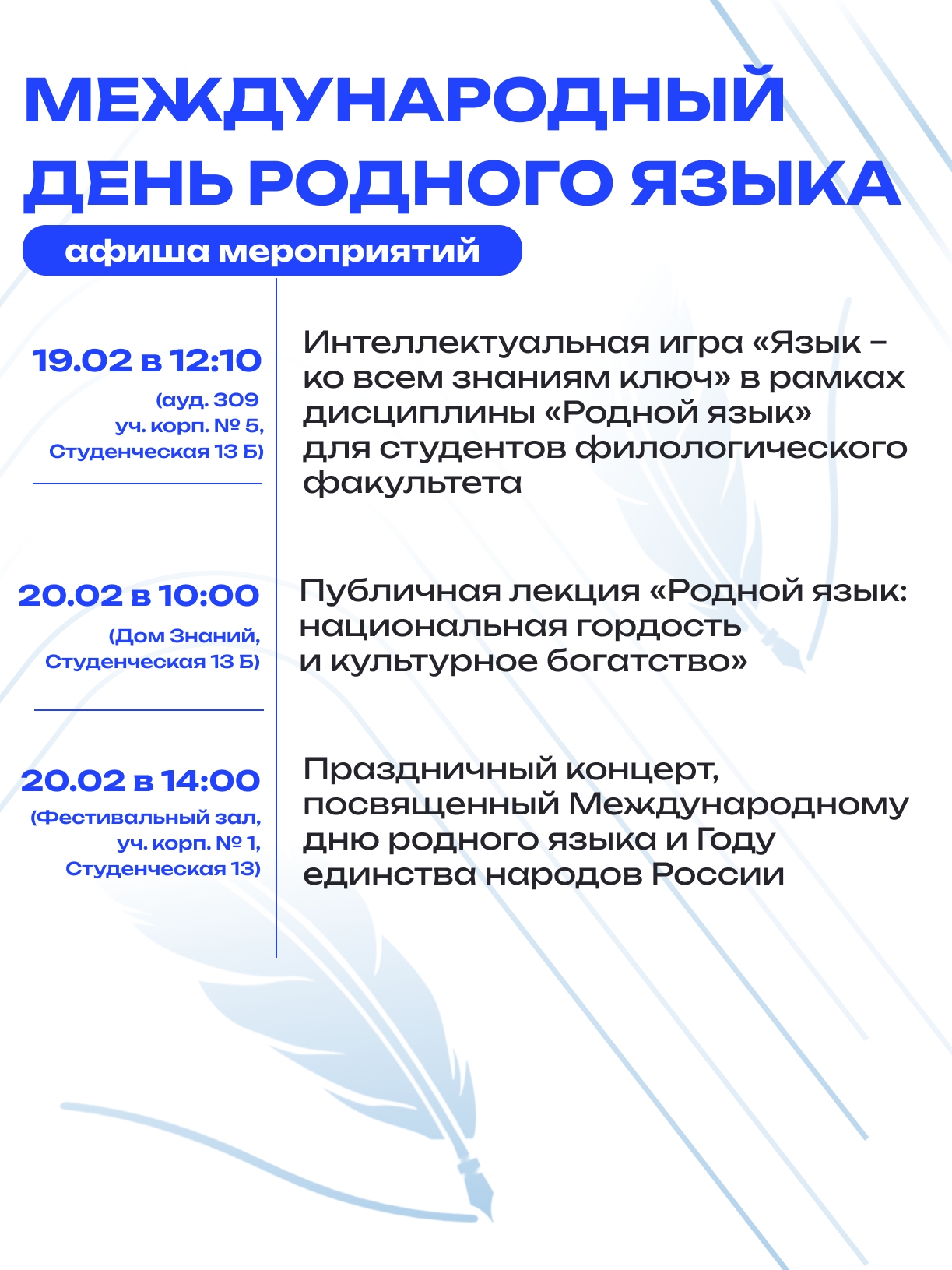 Мы убеждены, что сохранение языкового наследия – это ключевой вклад в укрепление гражданского единства и взаимопонимания. Приглашаем студентов и учащихся, преподавателей и учителей, всех, кто интересуется лингвистическим богатством нашей страны, стать участниками этих событий.