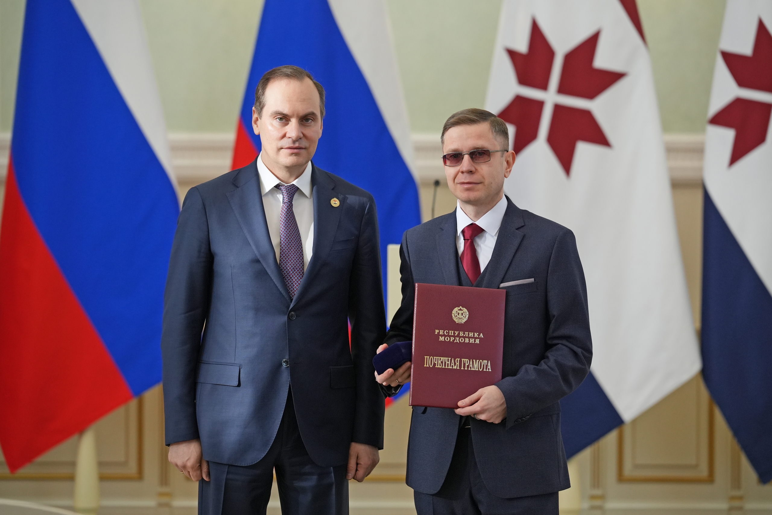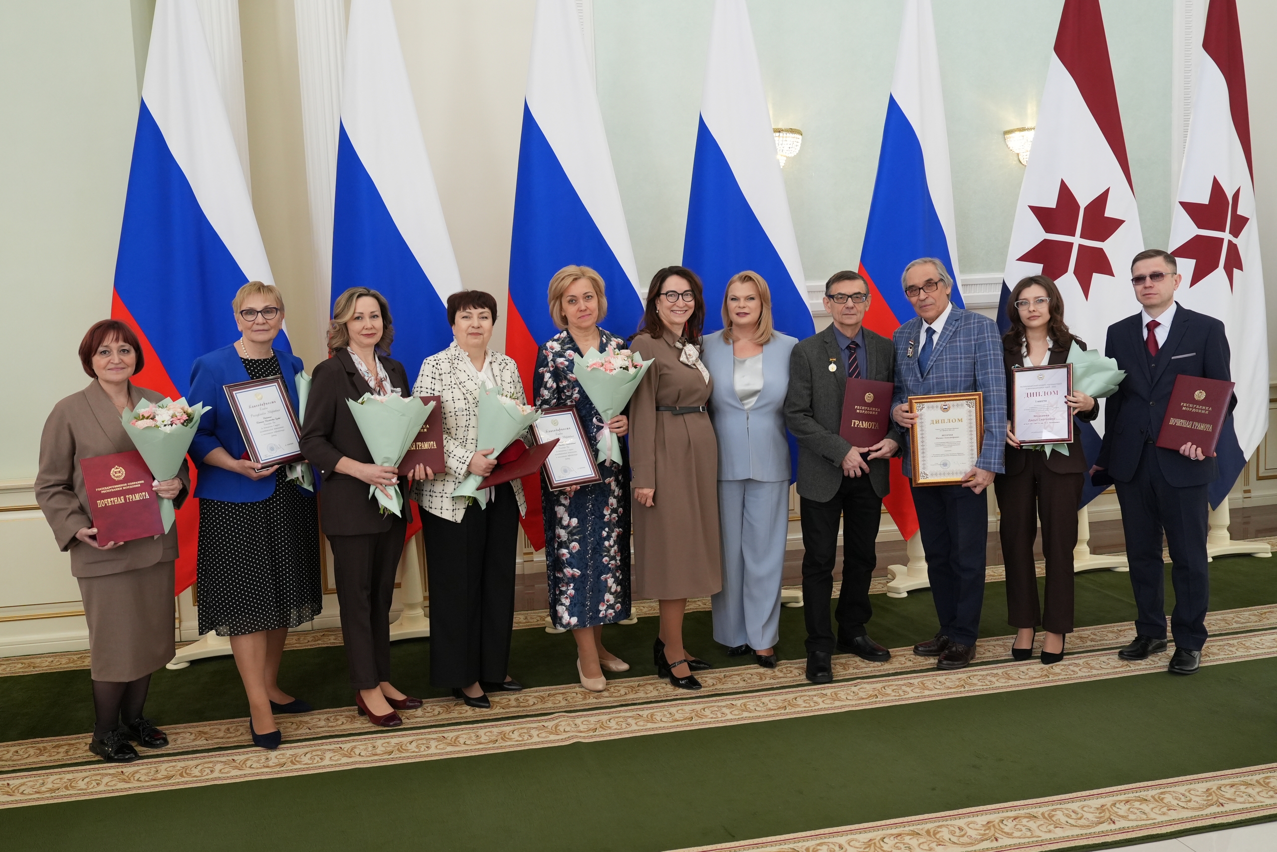 В торжественной обстановке были вручены федеральные и региональные награды, среди которых почетные грамоты и звания получили представители Мордовского государственного педагогического университета:
