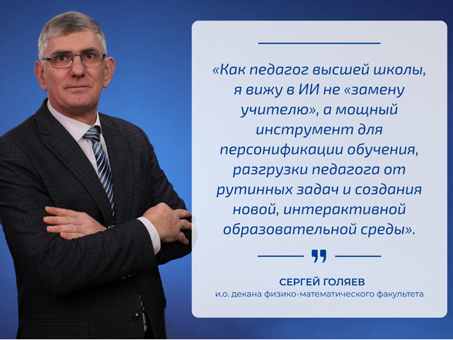 В рамках этой масштабной дискуссии особое значение приобретает мнение педагогического сообщества. Мордовский государственный педагогический университет имени М. Е. Евсевьева, как центр подготовки учительских кадров, внимательно следит за процессом цифровой трансформации образования. Экспертную позицию вуза комментирует Голяев Сергей Сергеевич, и.о. декана физико-математического факультета, кандидат педагогических наук, доцент кафедры физики, информационных технологий и методик обучения: