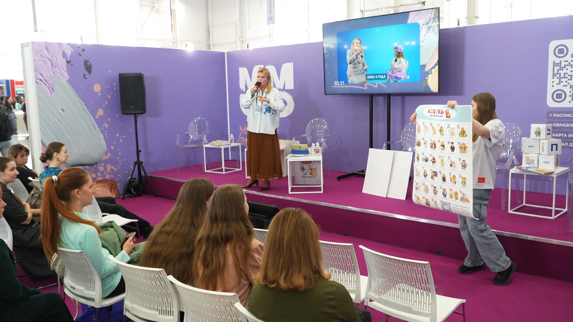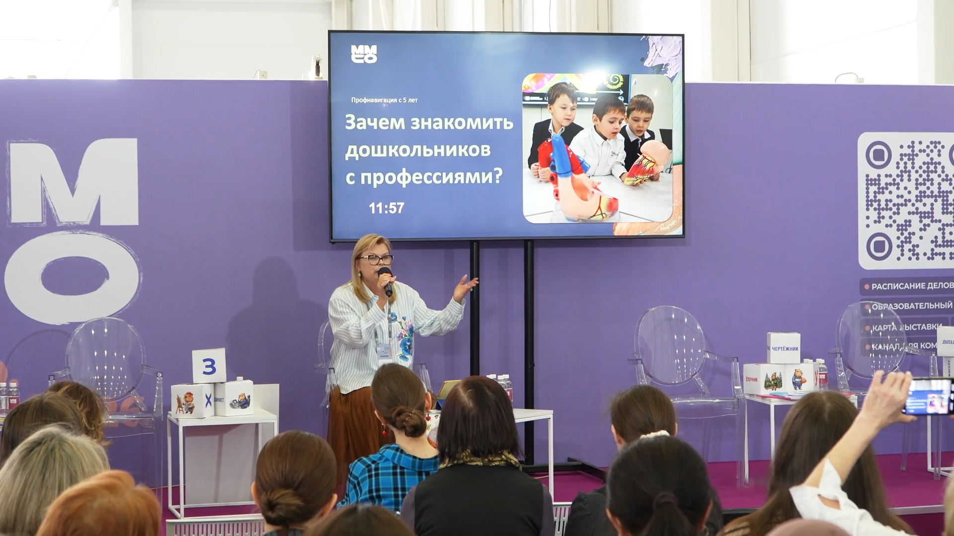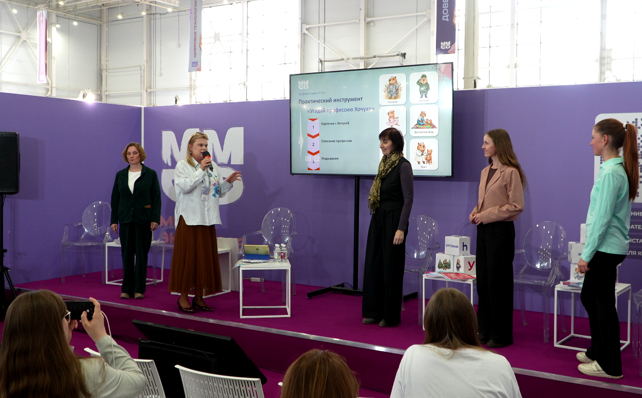 Во время сессии гости смогли сами попробовать разные форматы работы. Например, взяв карточку с изображением Хочухи в образе представителя профессии, они описывали её, не называя. После чего посмотрели видео о том, как воспитанники образовательного центра «Пеликан» при университете рассказали об этих же профессиях. Простая игровая механика наглядно показала, как дети увлечённо подмечают детали и осваивают сложные понятия.