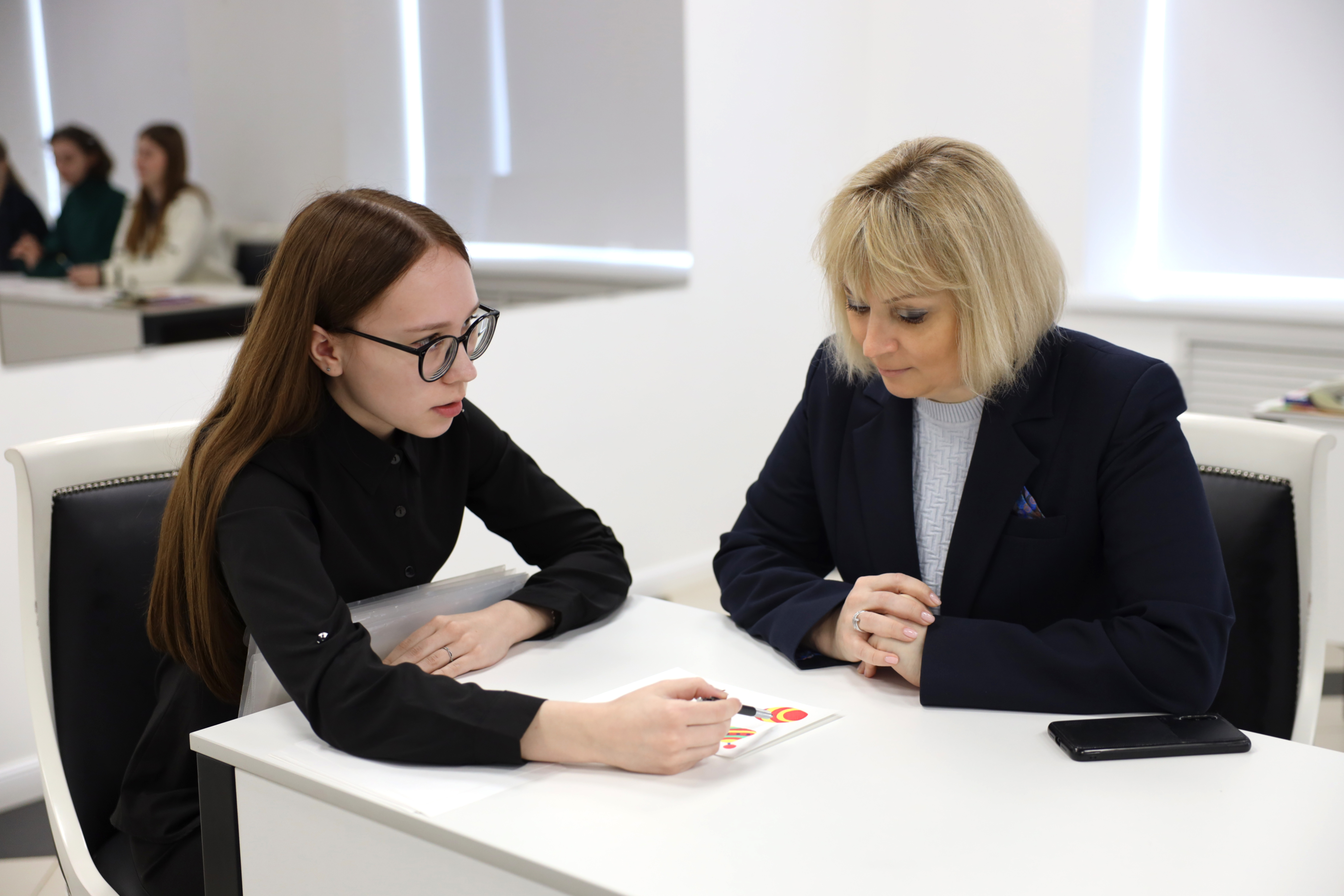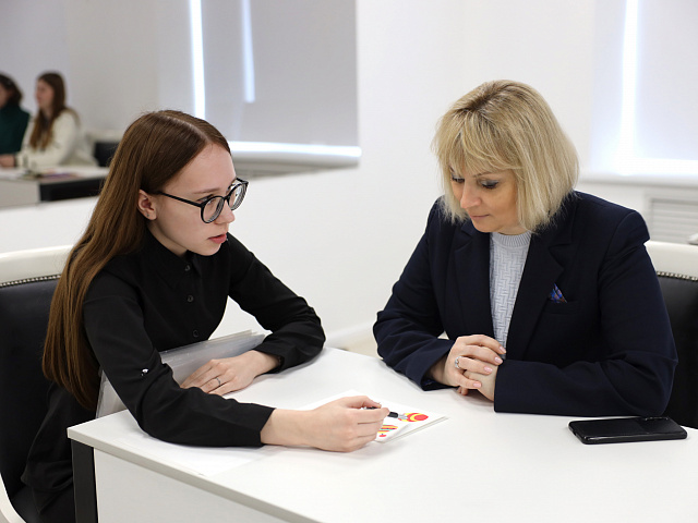 На площадке для проведения демонстрационного экзамена Ольга Павловна приняла участие в учебном консилиуме студентов-психологов и выступила в роли ребенка, который беседует со школьным психологом.