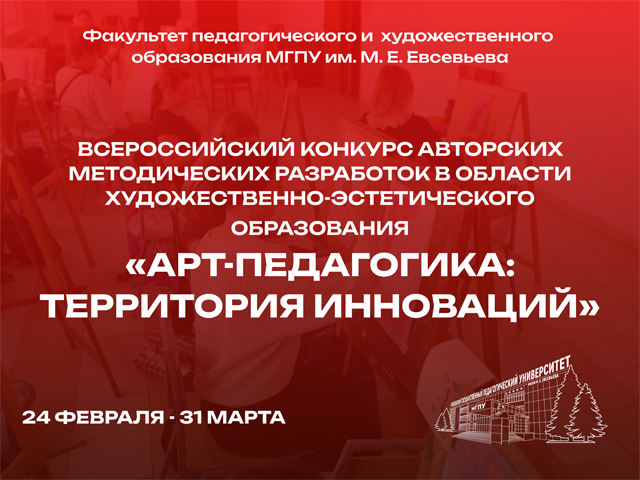 Факультет педагогического и художественного образования Мордовского государственного педагогического университета имени М. Е. Евсевьева приглашает всех желающих принять участие во Всероссийском конкурсе авторских методических разработок в области художественно-эстетического образования «Арт-педагогика: территория инноваций», посвященном Году единства народов России, который проводится с 24 февраля по 31 марта 2026 года. Орган...