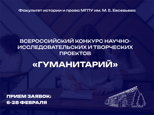 Кафедра отечественной и зарубежной истории и методики обучения Мордовского государственного педагогического университета имени М. Е. Евсевьева и базовая кафедра исторического и обществоведческого образования МОУ «Средняя общеобразовательная школа с углубленным изучением отдельных предметов № 36» г. о. Саранск объявляет о старте Всероссийского конкурса научно-исследовательских и творческих проектов «Гуманитарий». Приглашаются к участию ...