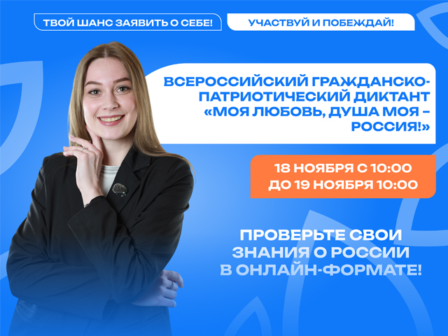 Уважаемые студенты, преподаватели и сотрудники Мордовского государственного педагогического университета! Приглашаем вас принять участие во Всероссийском гражданско-патриотическом диктанте «Моя любовь, душа моя – Россия!». Диктант – отличная возможность проверить свои знания истории и культуры нашей страны, а также внести свой вклад в сохранение и укрепление традиционных духовно-нравственных ценностей. Дата провед...