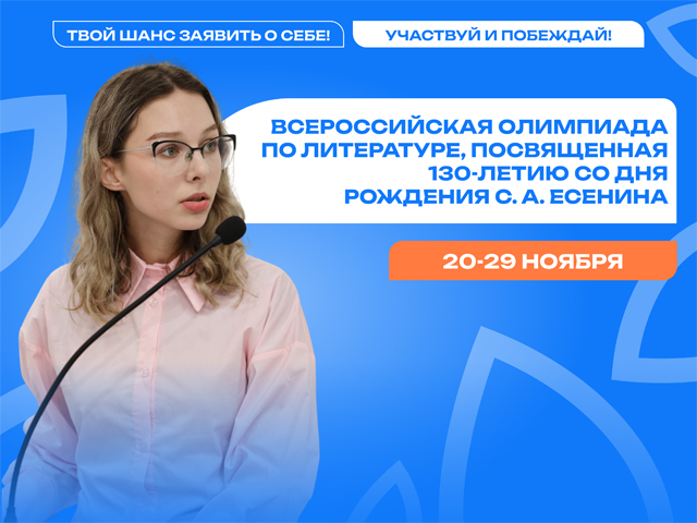 Филологический факультет Мордовского государственного педагогического университета имени М. Е. Евсевьева приглашает студентов и школьников принять участие во Всероссийской олимпиаде по литературе, посвященной 130-летию со дня рождения С. А. Есенина, которая проводится с 20 по 29 ноября 2025 года. Конкурс проводится в целях выявления широты литературного кругозора студентов и школьников, глубины их литературоведческих знаний...