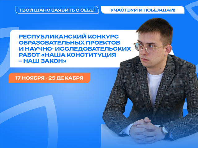 С 17 НОЯБРЯ 2025 ГОДА ПО 20 ДЕКАБРЯ 2025 ГОДА НА ФАКУЛЬТЕТЕ ИСТОРИИ И ПРАВА СТАРТУЕТ РЕСПУБЛИКАНСКИЙ КОНКУРС ОБРАЗОВАТЕЛЬНЫХ ПРОЕКТОВ И НАУЧНО-ИССЛЕДОВАТЕЛЬСКИХ РАБОТ СТУДЕНТОВ И ШКОЛЬНИКОВ В ОБЛАСТИ КОНСТИТУЦИОННОГО ПРАВА «НАША КОНСТИТУЦИЯ – НАШ ЗАКОН». ЦЕЛЬЮ КОНКУРСА ЯВЛЯЕТСЯ ПРИВЛЕЧЕНИЕ СТУДЕНТОВ И ШКОЛЬНИКОВ К НАУЧНЫМ ИССЛЕДОВАНИЯМ В ОБЛАСТИ КОНСТИТУЦИОННОГО ПРАВА, ПОВЫШЕНИЕ УРОВНЯ ПРАВОВОЙ И ПОЛИТИЧЕСКОЙ КУЛЬТУРЫ, А ТАКЖЕ ВЫЯВЛЕ...