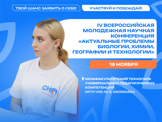 19 ноября 2025 года на базе Межфакультетского технопарка универсальных педагогических компетенций МГПУ им. М. Е. Евсевьева состоится IV Всероссийская молодежная научная конференция «Актуальные проблемы биологии, химии, географии и технологии». Целью конференции является обобщение накопленного опыта и выявление наиболее актуальных направлений научных исследований в области биологии, географии, химии и технологии, а также теории и мето...